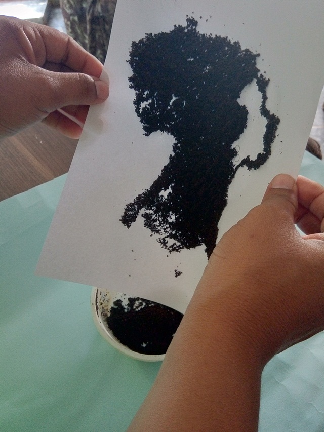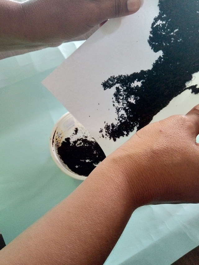 Paso 4. Cumplido el tiempo de secado, agité muy bien la hoja para retirar todo el excedente de café