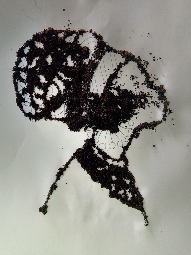 Paso 3. Luego fui agregando el café poco a poco hasta cubrir totalmente la silueta de nuestra muñeca africana. Deje secar por espacio de media hora aproximadamente para poder retirar el exceso de café.
