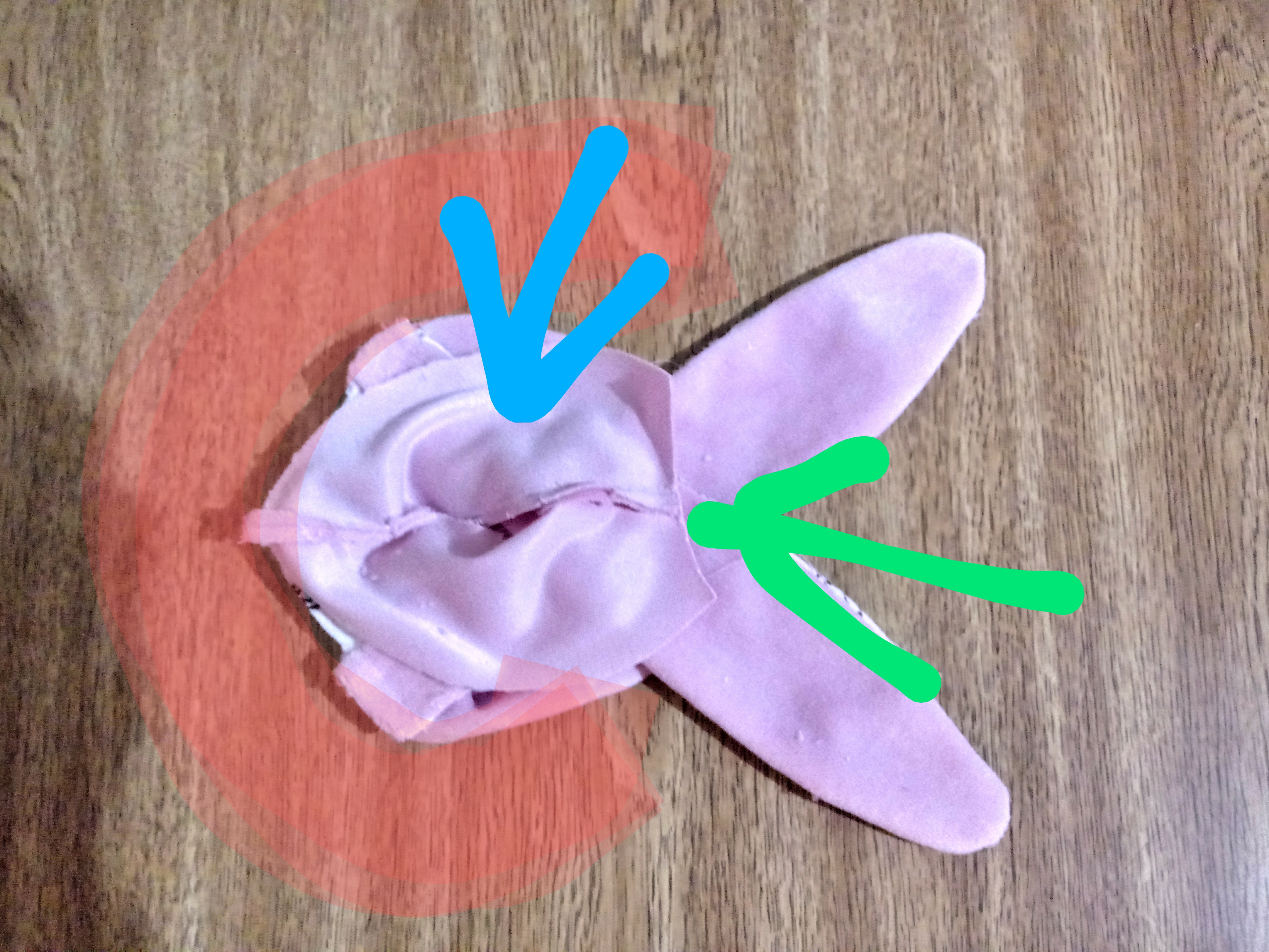 Me gusta comprobar si quedaron bien posicionadas las orejas, antes de coser la parte trasera de la cabeza. Aquí verifico, si quedaron bien debería verse así: