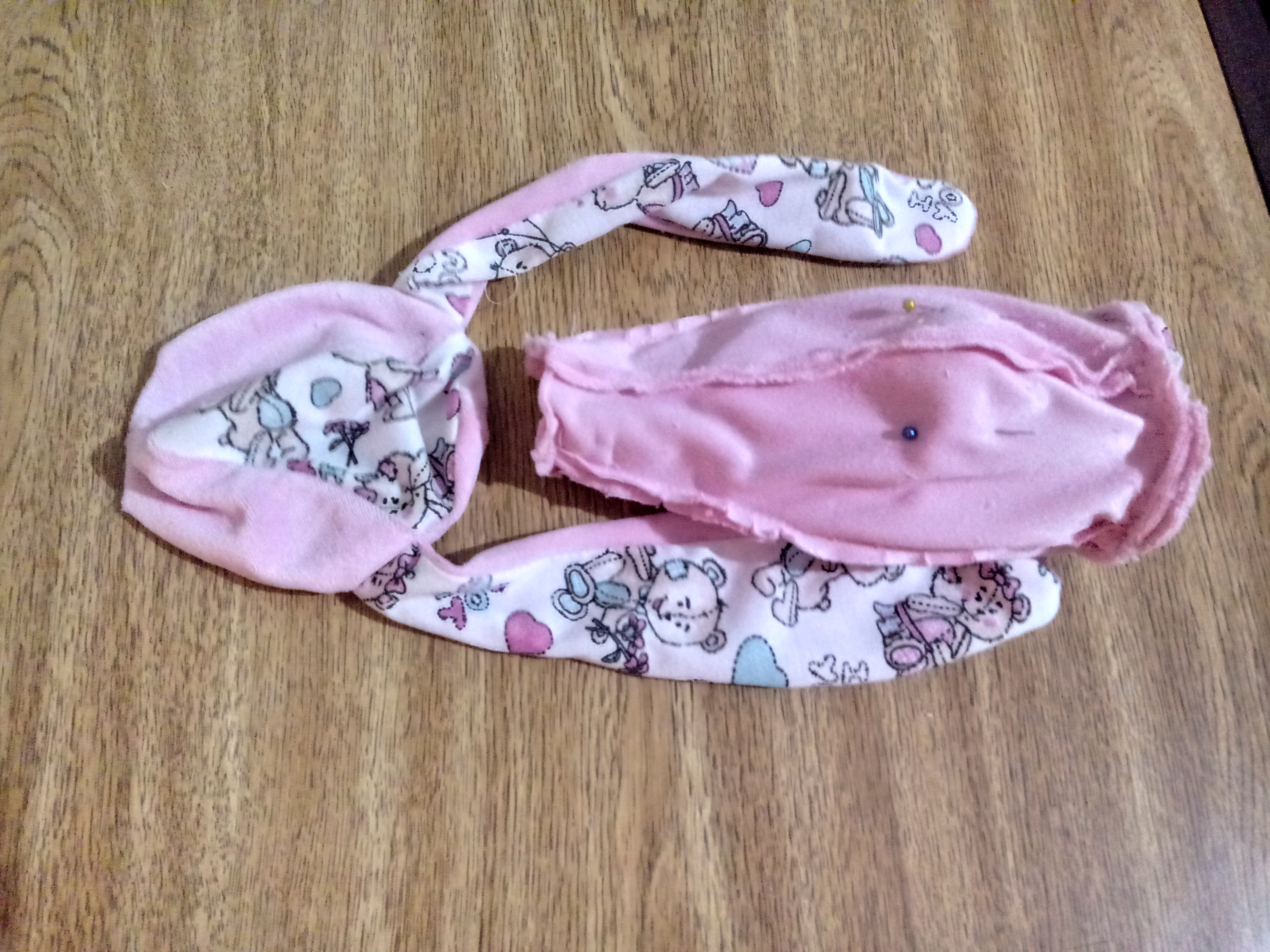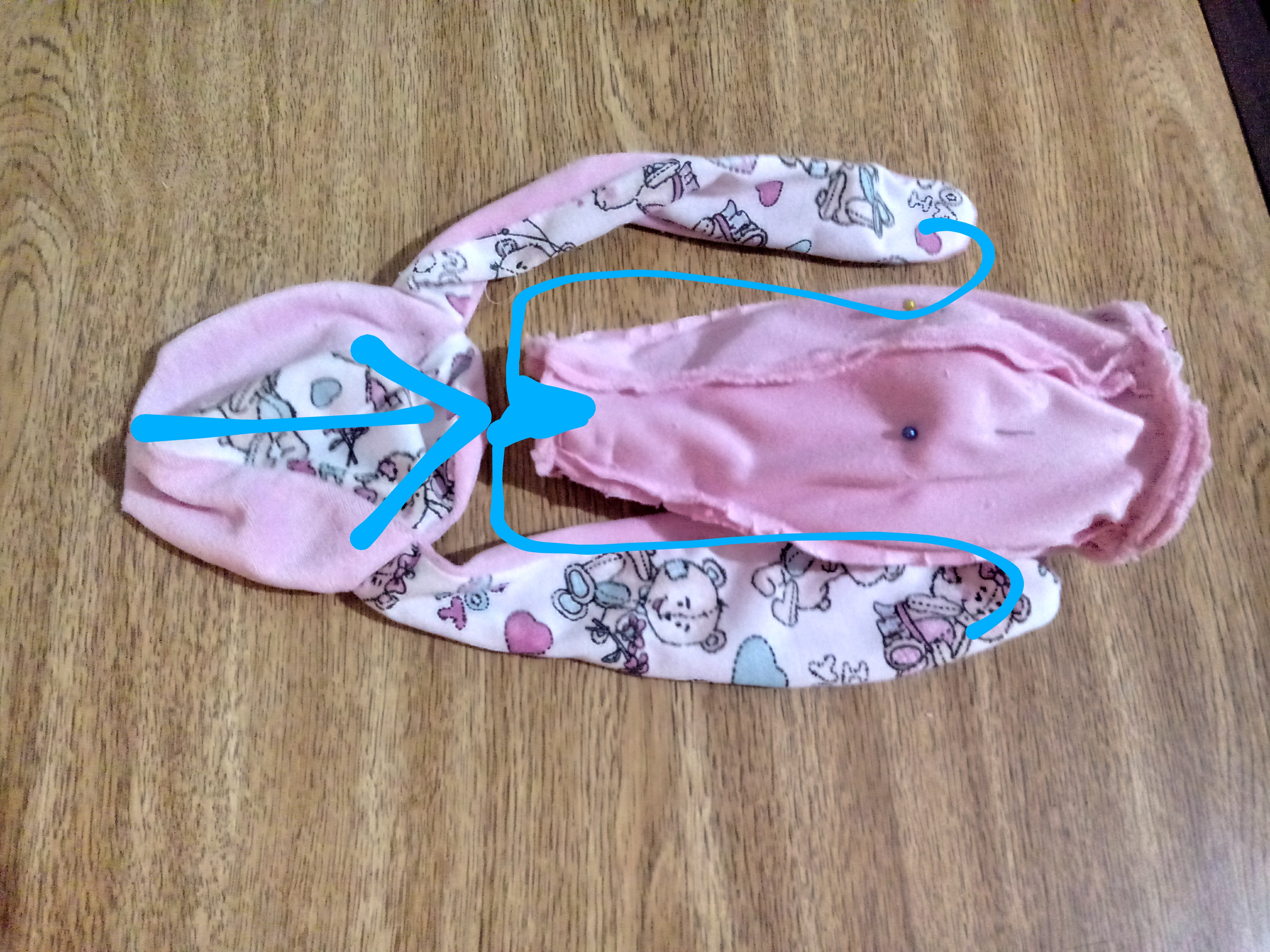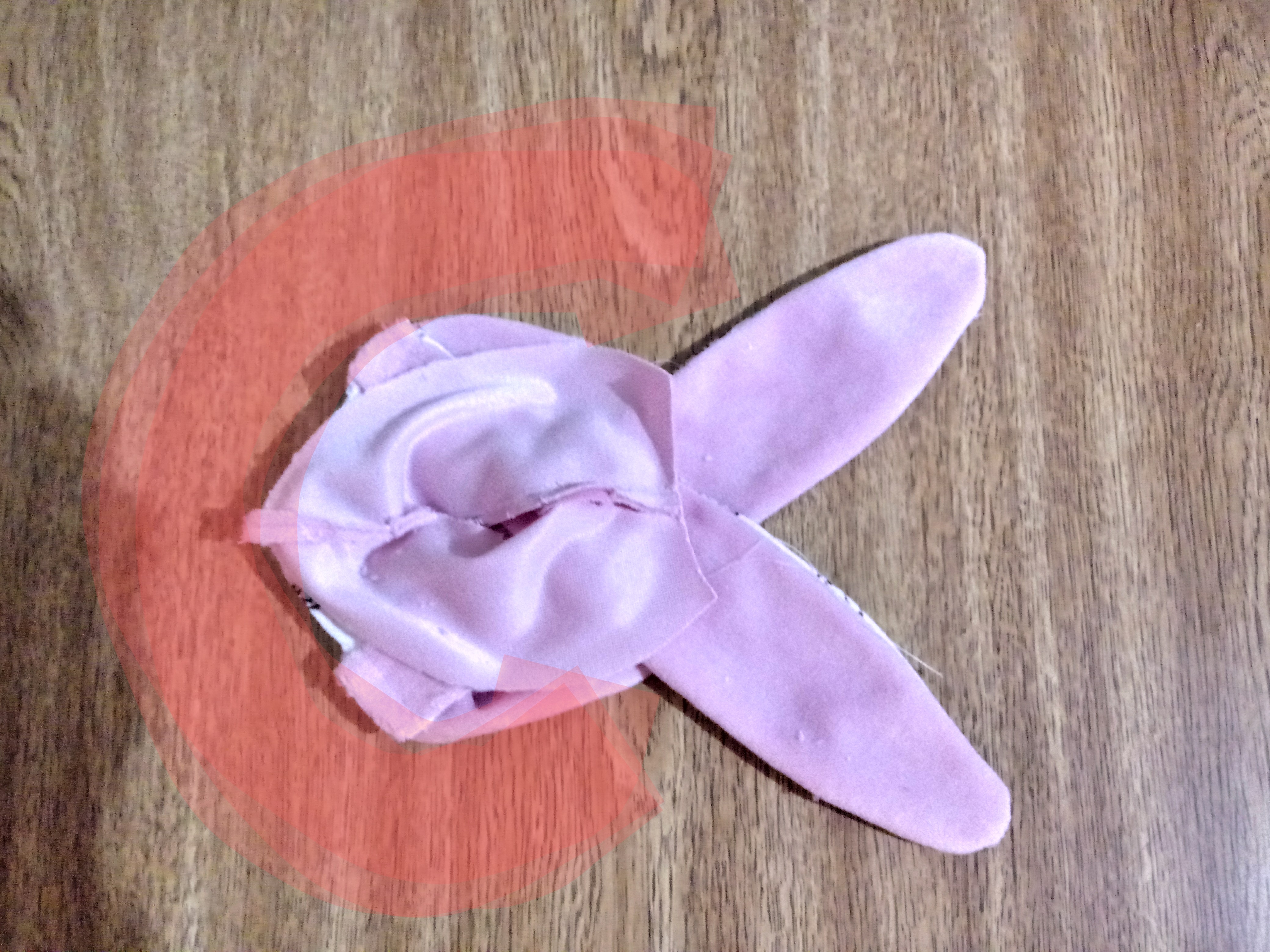 Entonces doblo las orejas hacia el cuello y poloco la pieza trasera de la cabeza, enfrentando derecho con derecho. Y señalé en la foto con una marca roja por dónde voy pasar la costura.