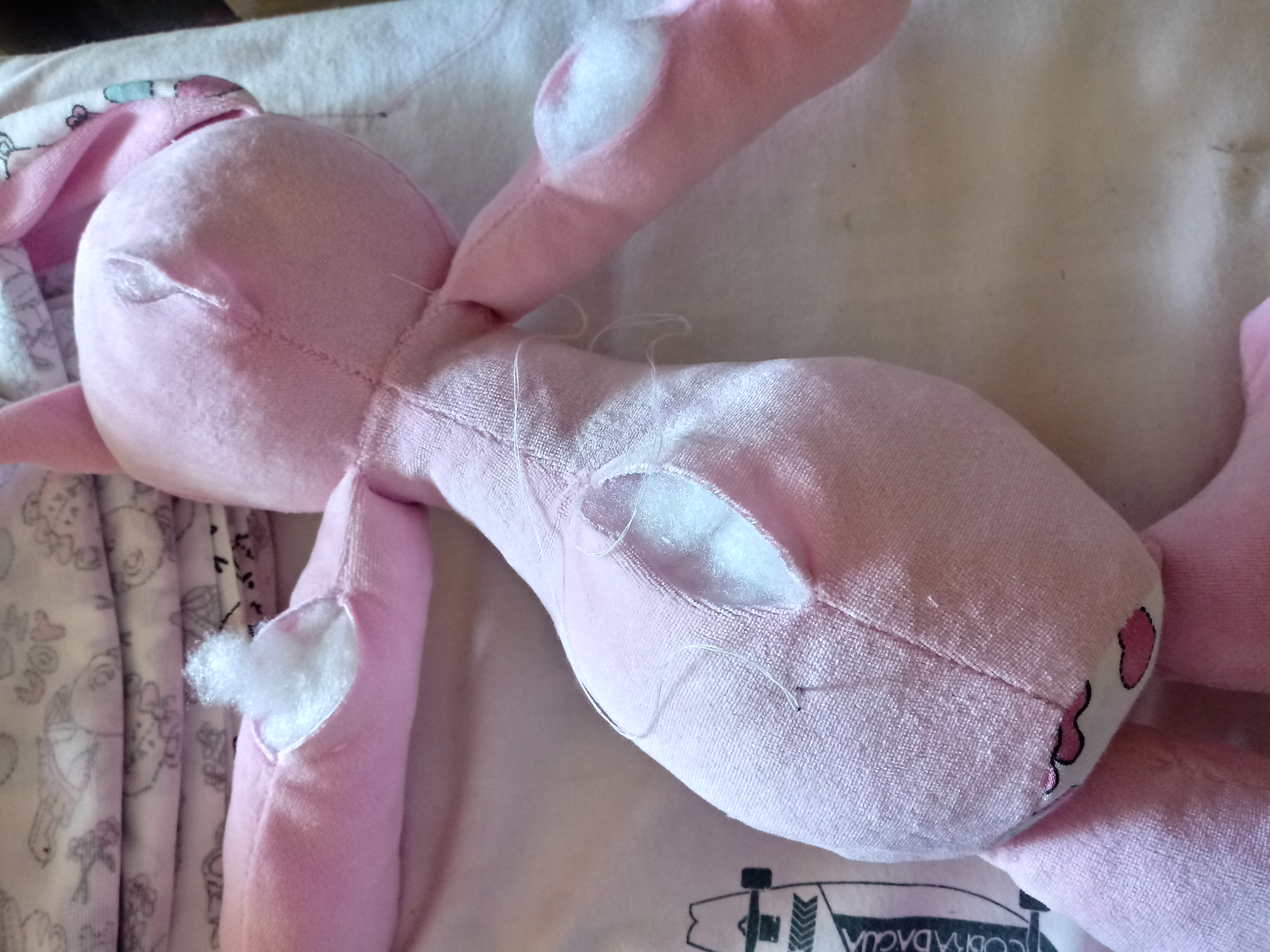 Ahora cosemos las patitas superiores. Dejar una pequeña abertura para rellenar.