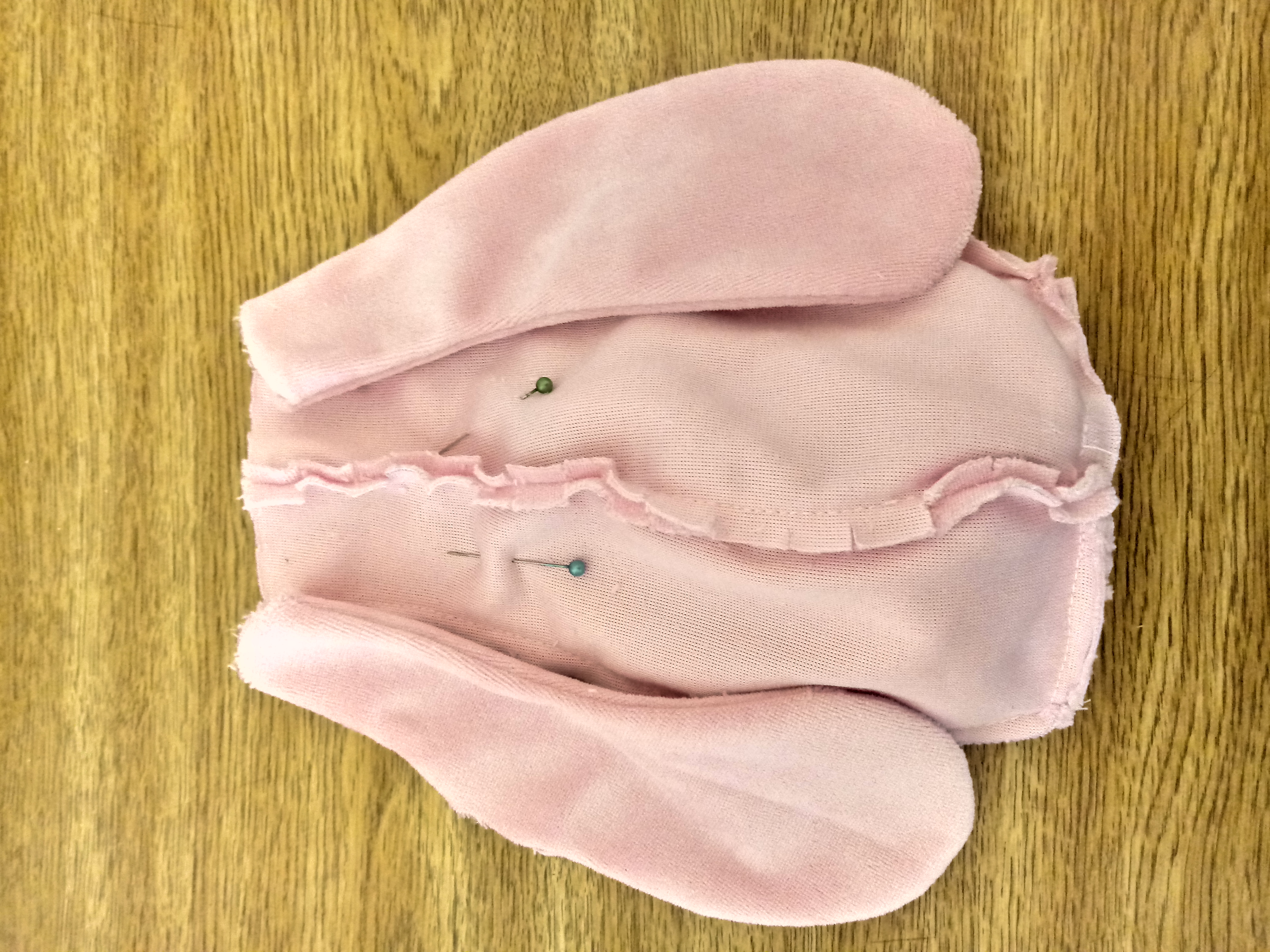 Volteamos la pieza y colocamos las orejas, recordando que la parte estampada de las orejas debe quedar hacia abajo. Cosemos las dos orejitas a esa pieza