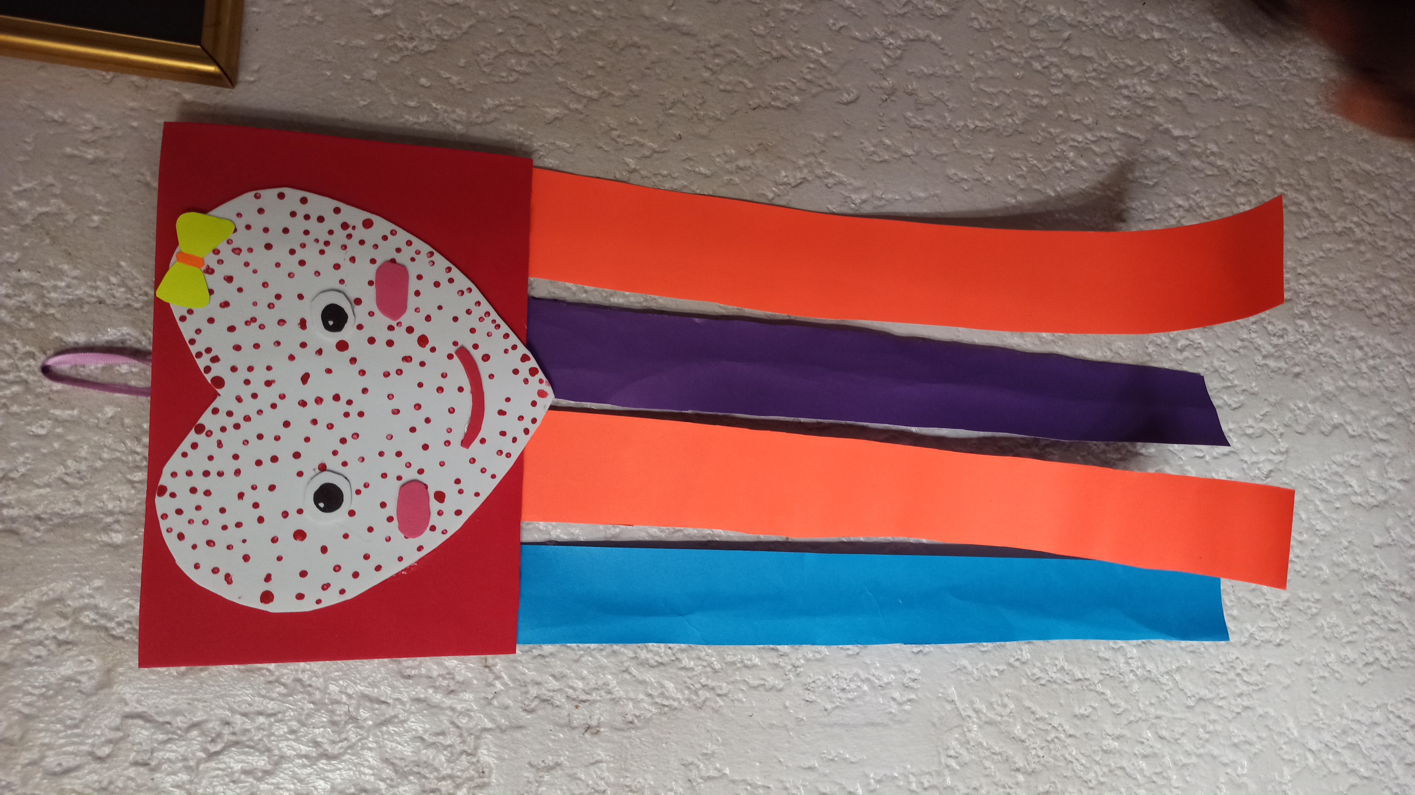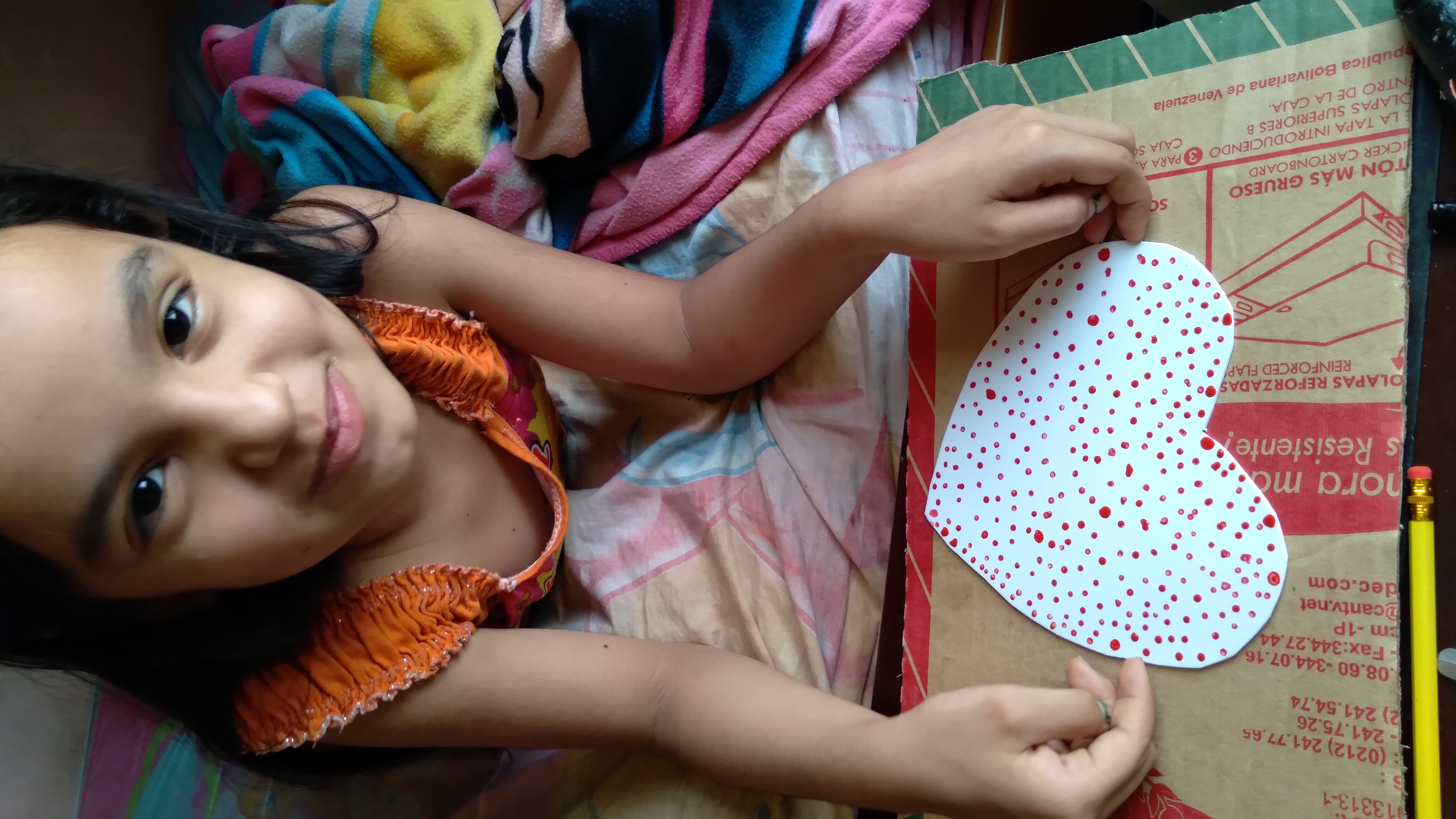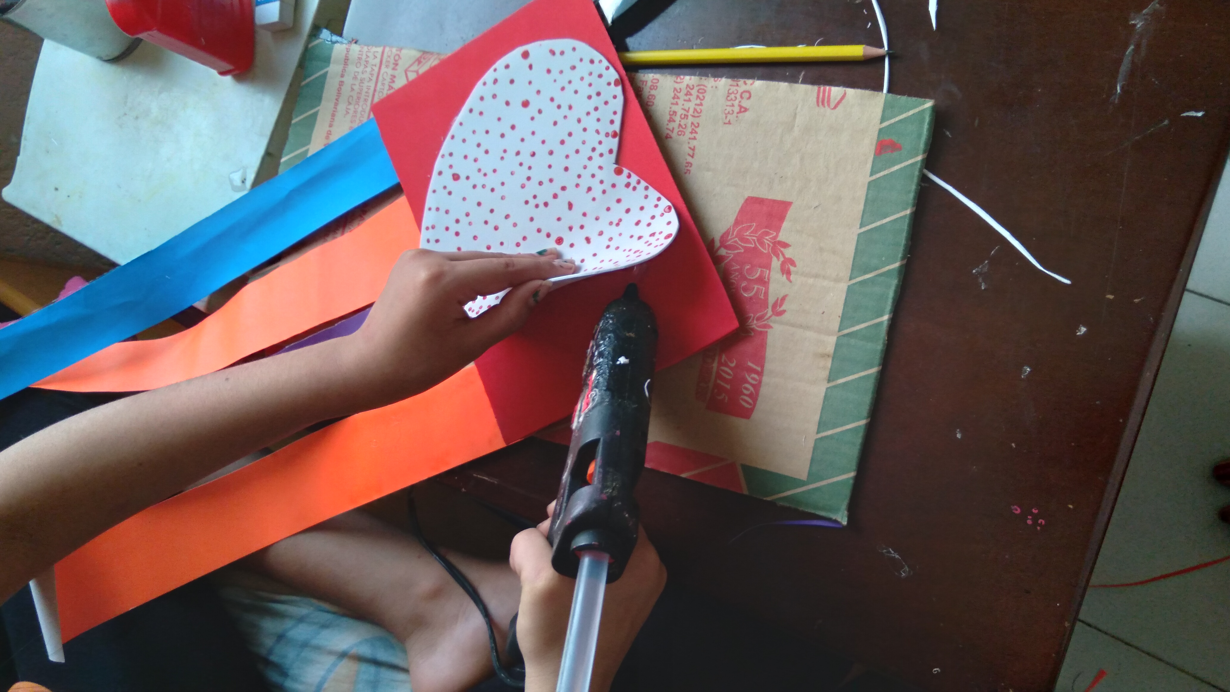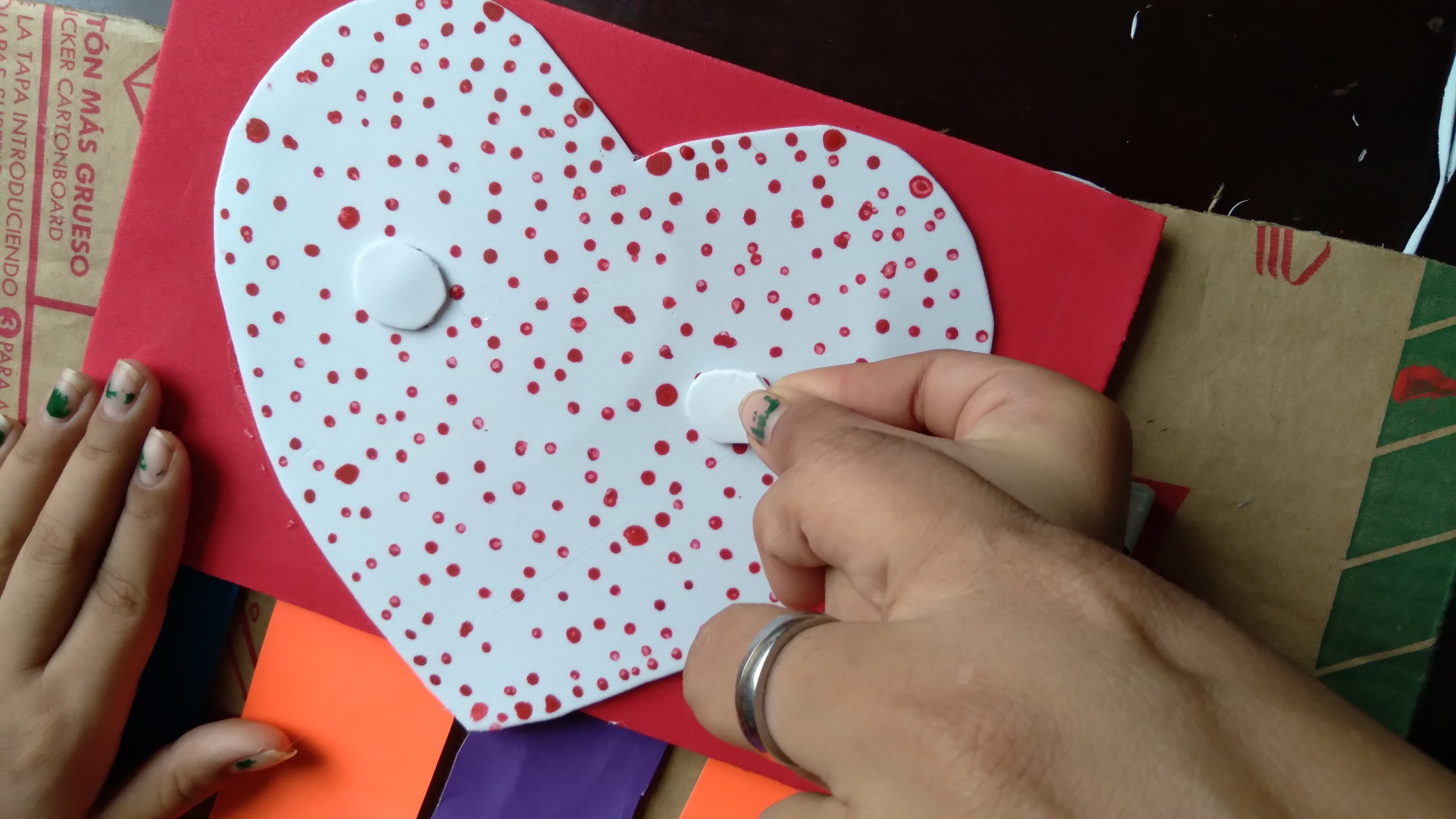 Recorto tiras largas en cartulina de colores y las voy a pegar detrás de cartón que forre, una vez que los puntos del corazón están secos voy a pegar el corazón al cartón.