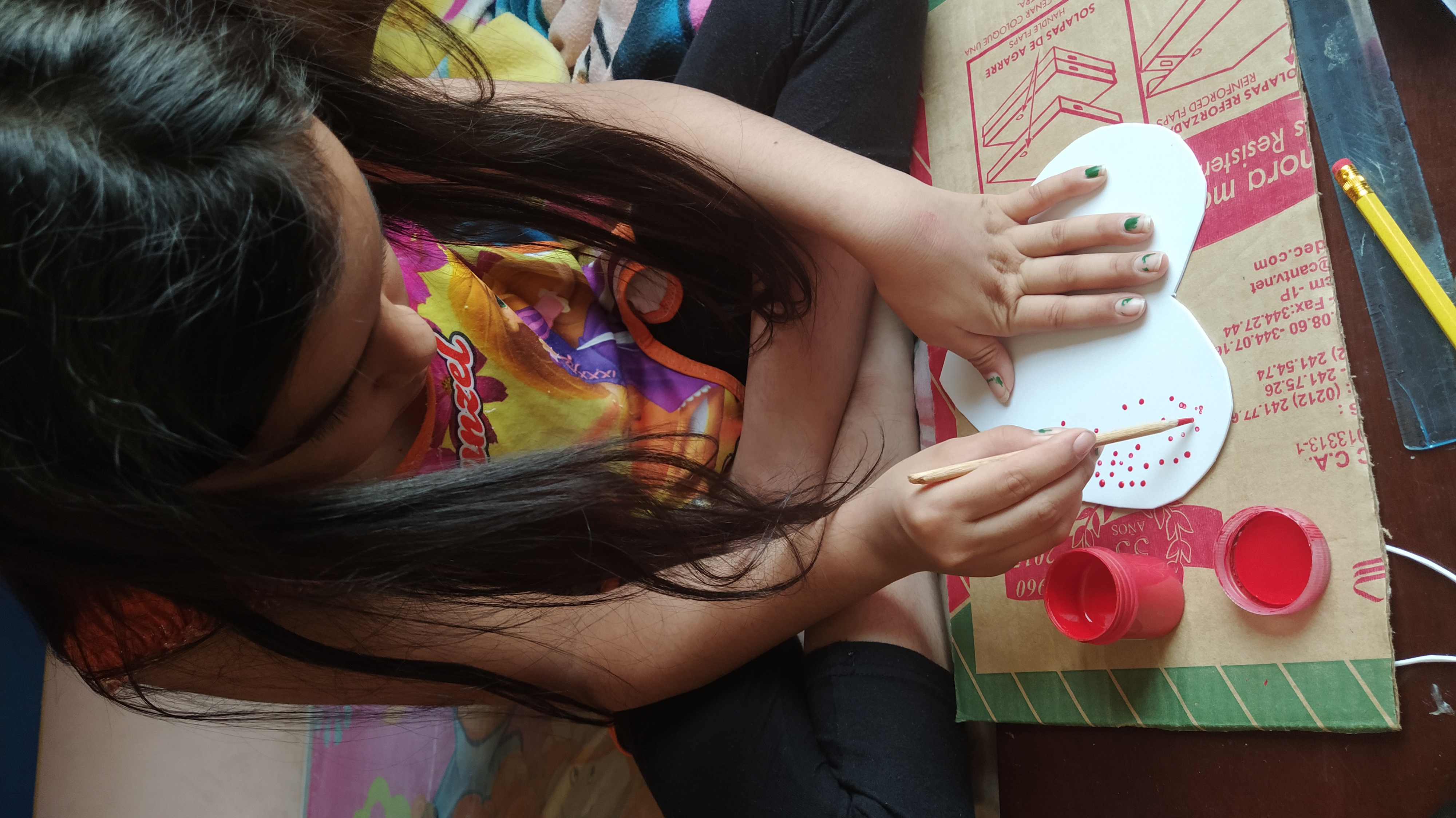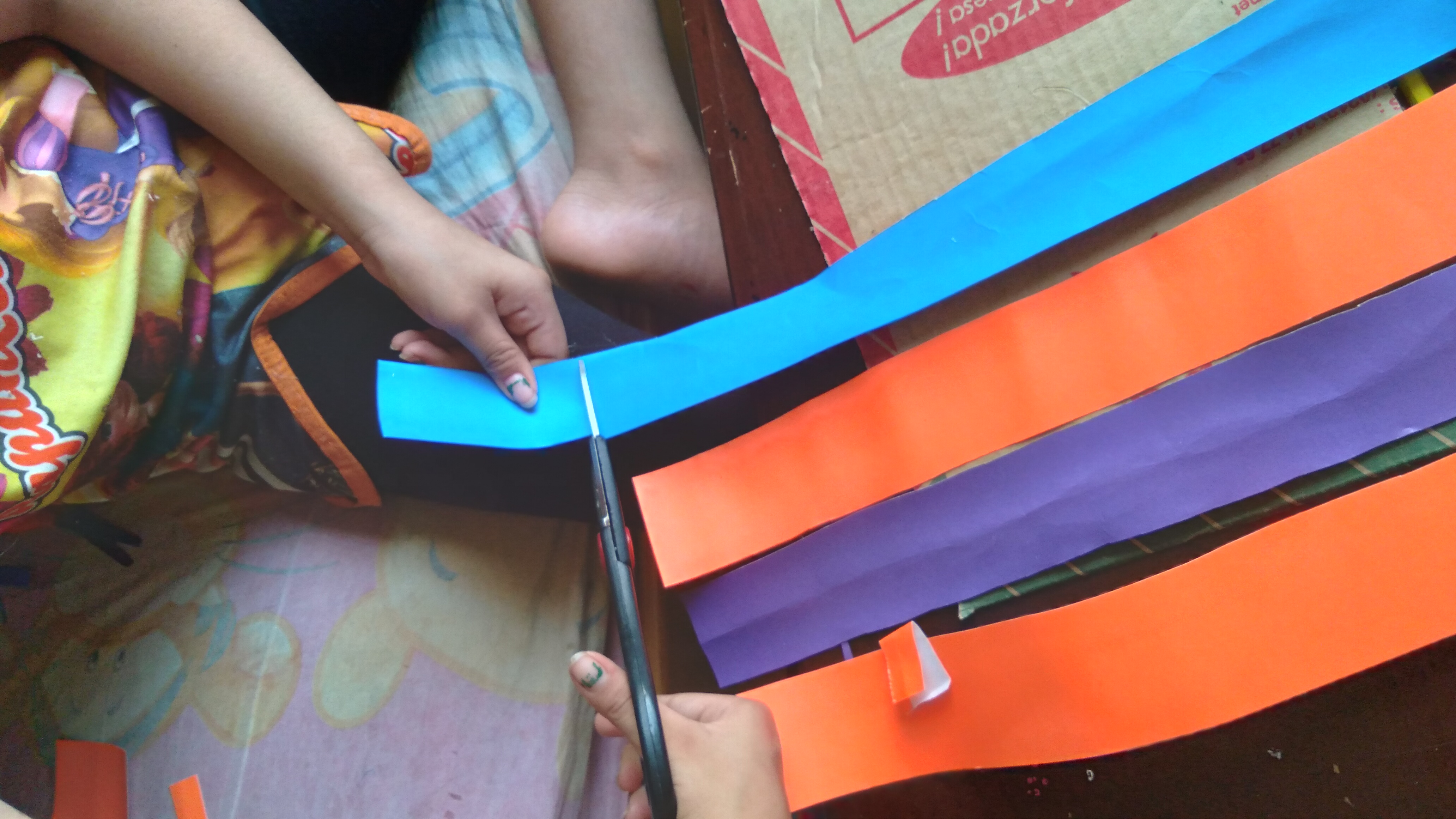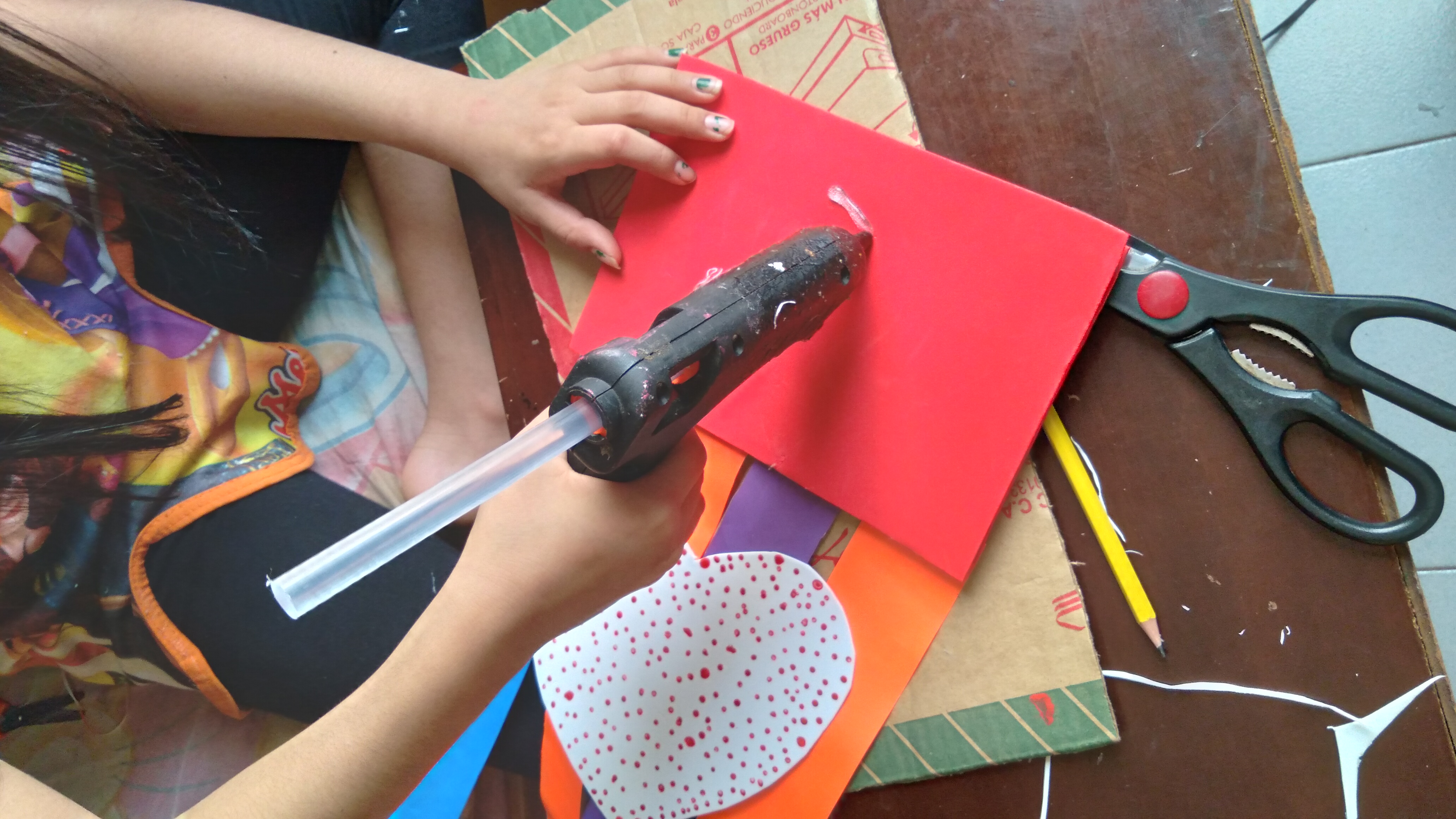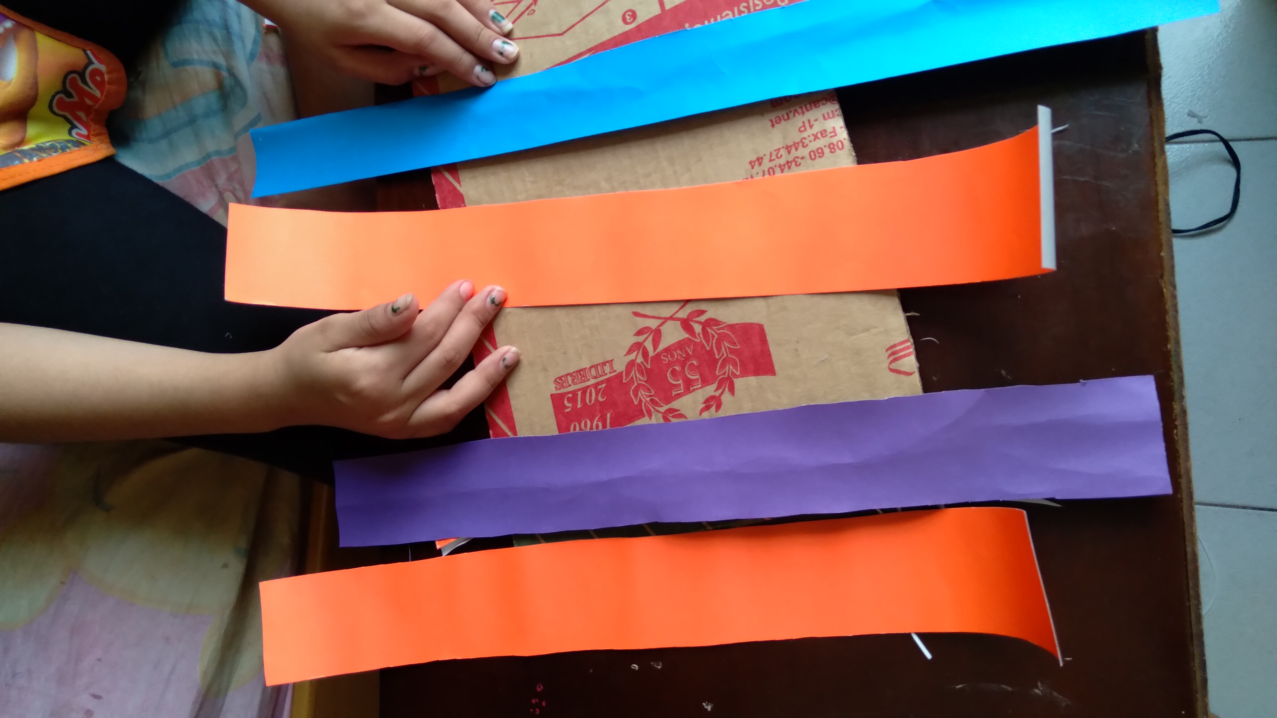 Recorto tiras largas en cartulina de colores y las voy a pegar detrás de cartón que forre, una vez que los puntos del corazón están secos voy a pegar el corazón al cartón.