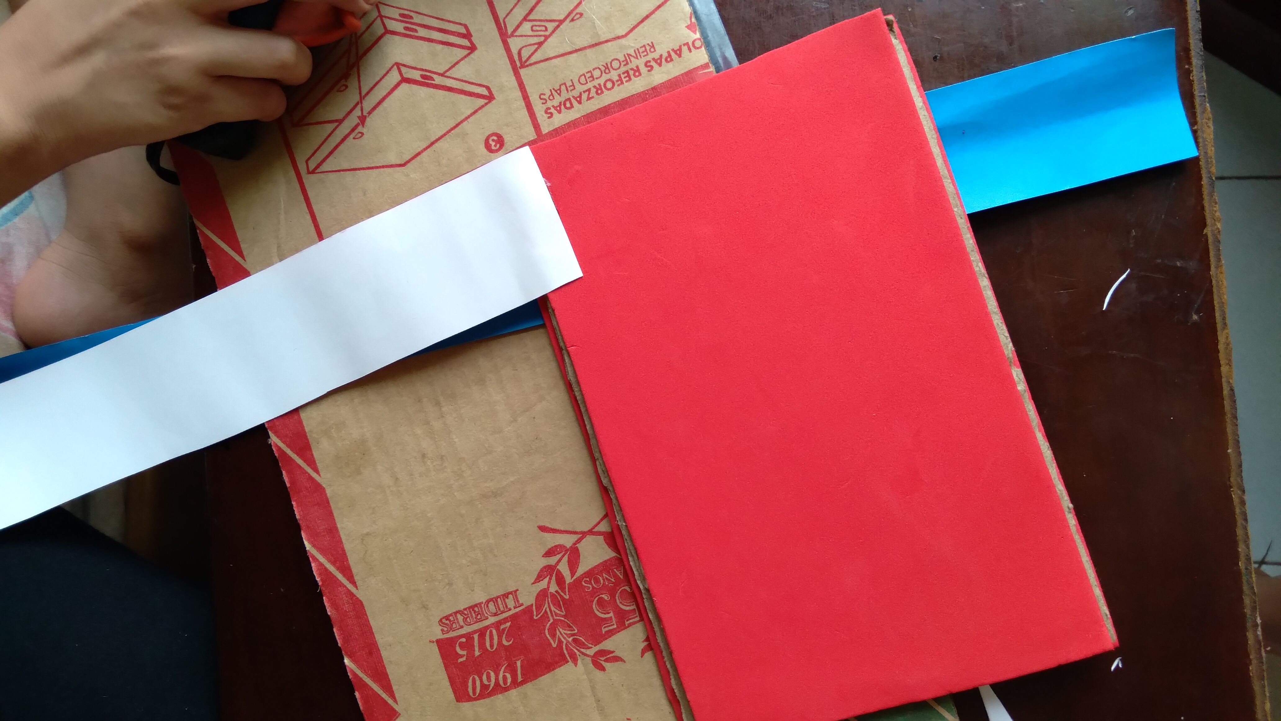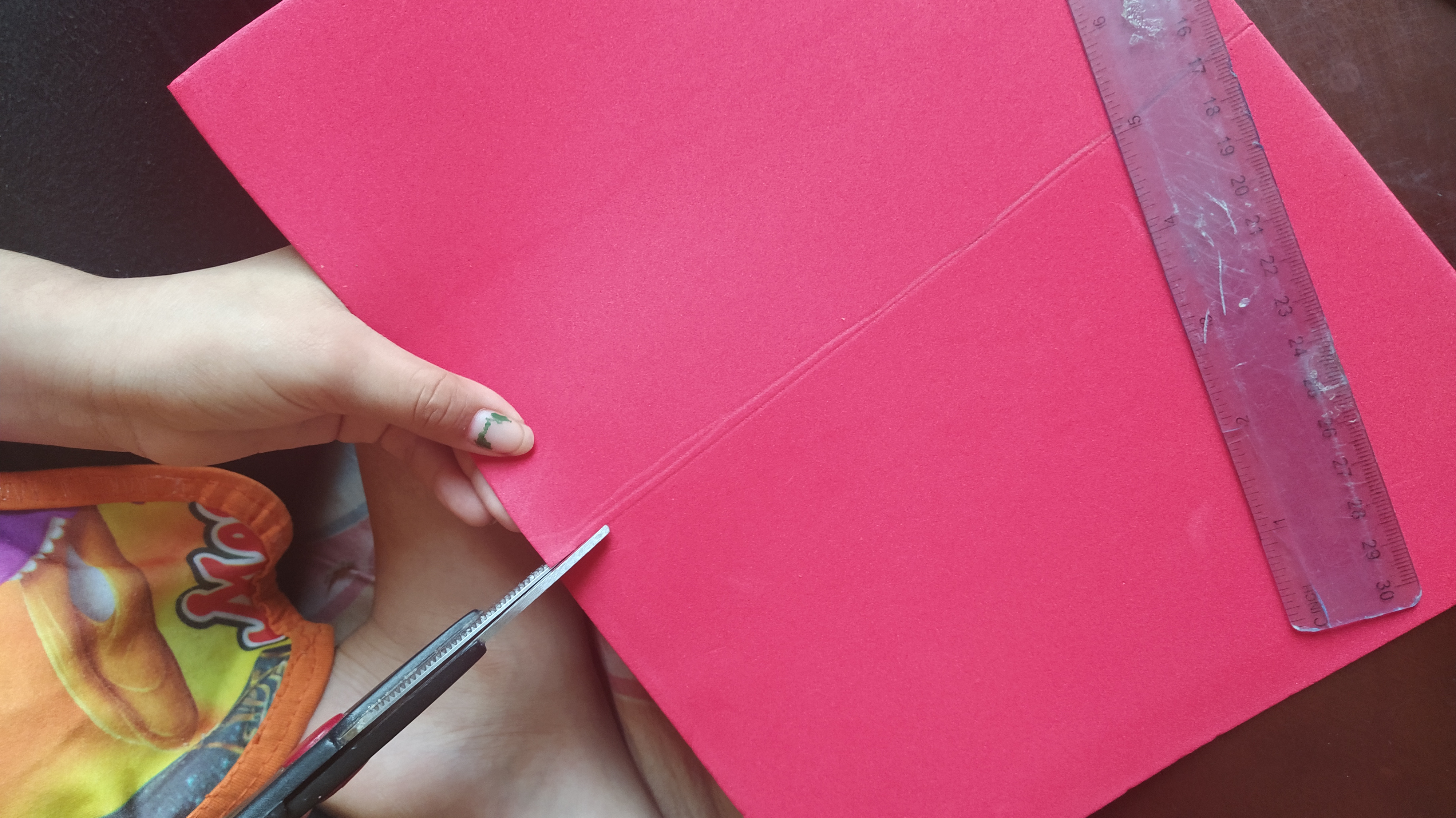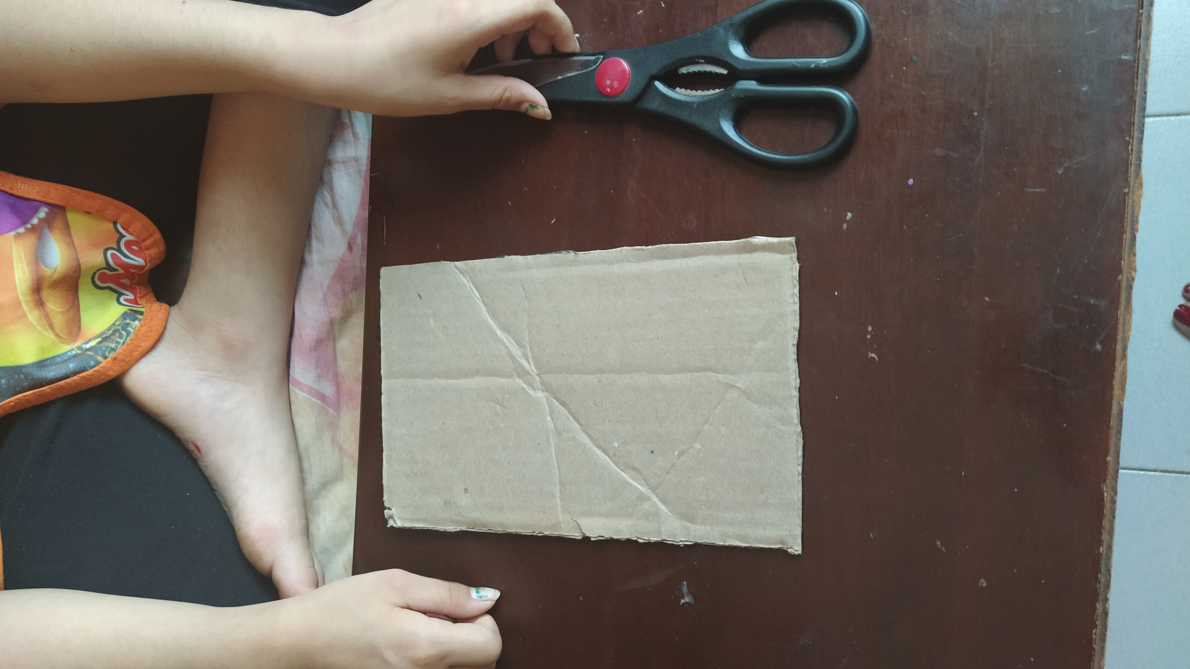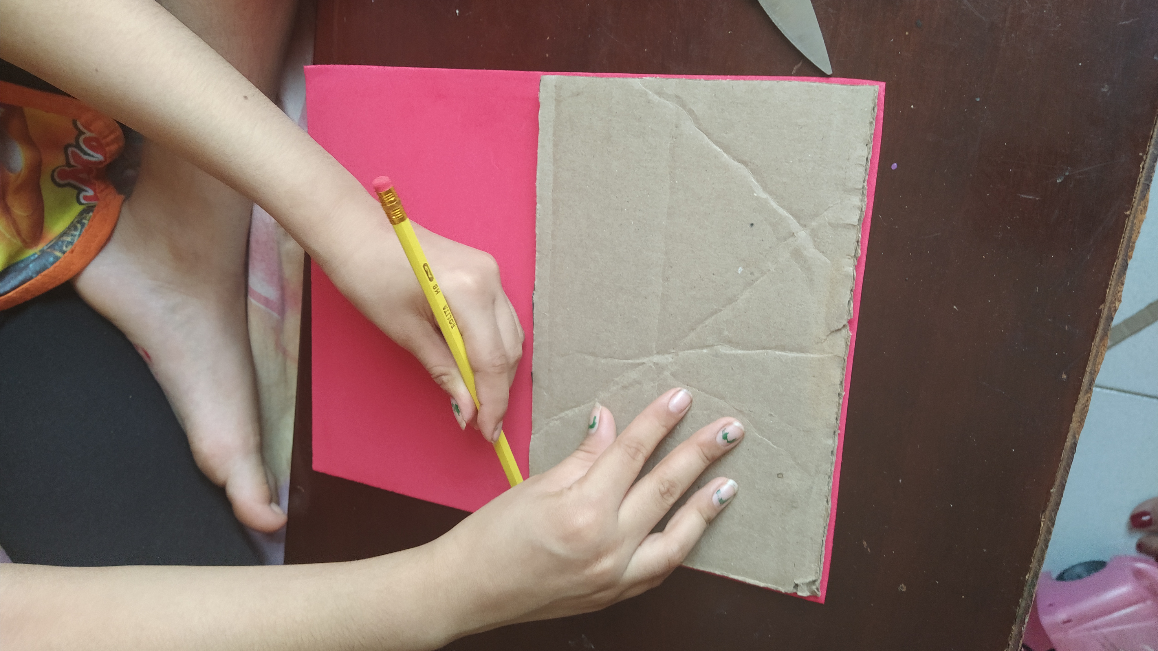 Primero comienzo cortando el pedazo de cartón que voy a usar, y luego medí y recorte dos cuadros de foamy para forrar mi cartón.