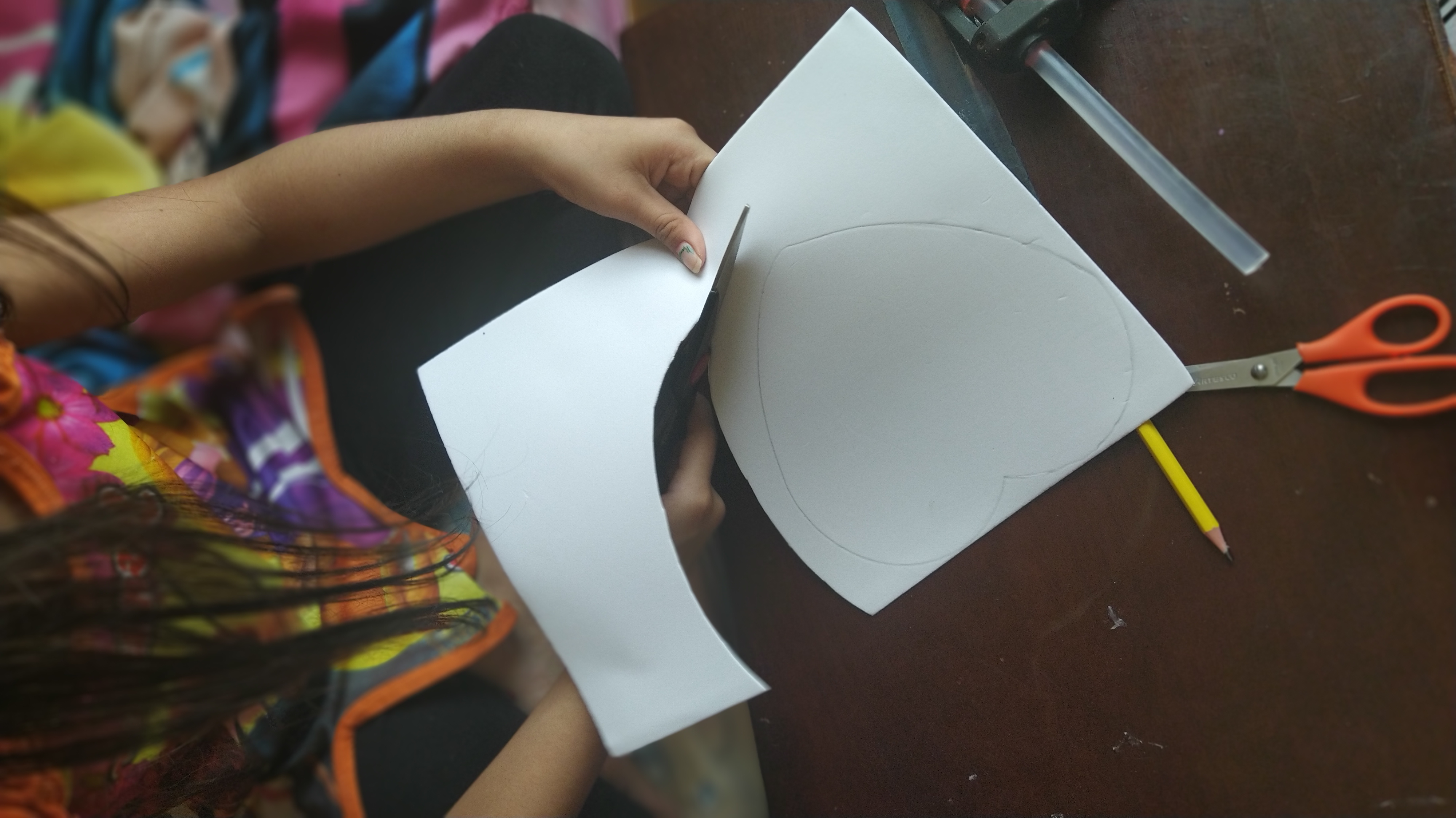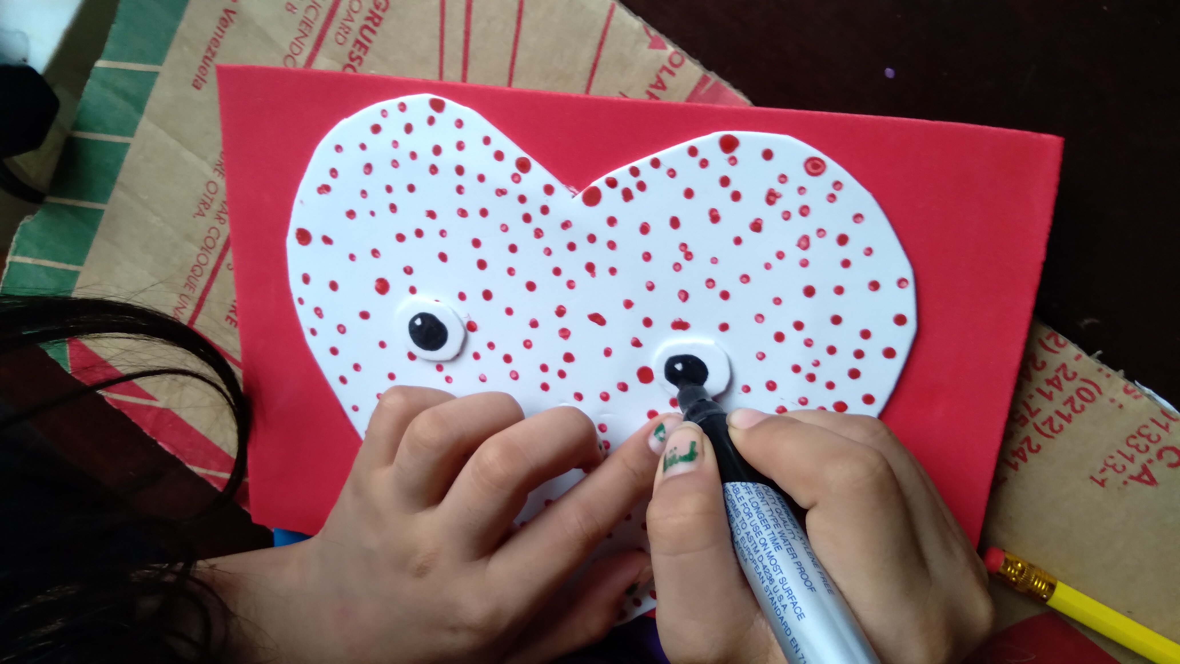 Voy a marcar en foamy blanco un corazón y uso un molde de corazón para que me salga mas derecho, luego lo recorto y uso pintura y un palillo para rellenarlos de punticos rojos.