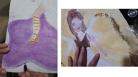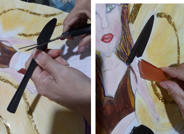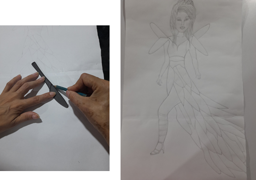 Paso # 5: Corto los cuchillos para luego pegarlos al dibujo que serán la falda de la mujer, y también coloco algunas piedras metálicas en la cintura.