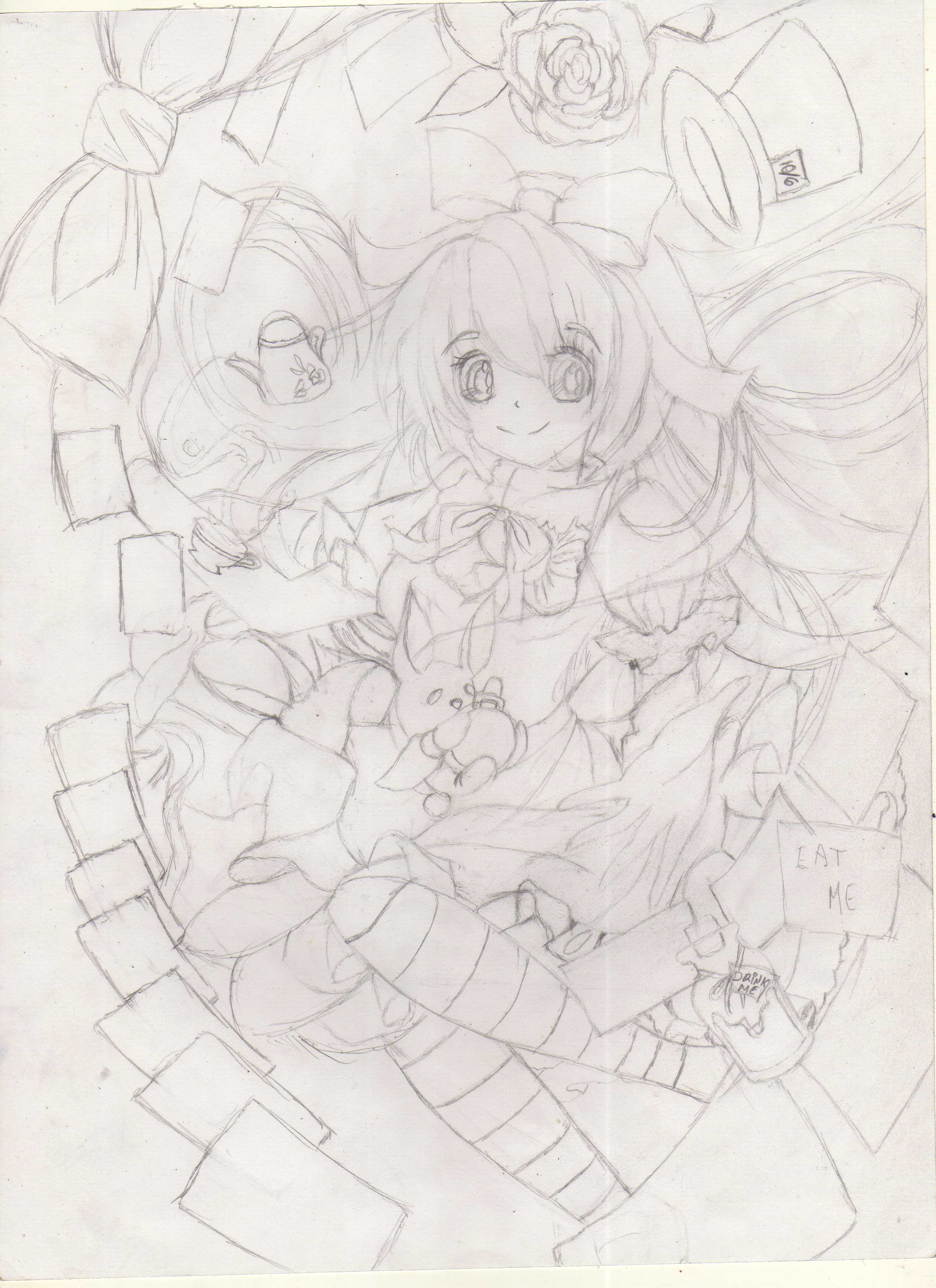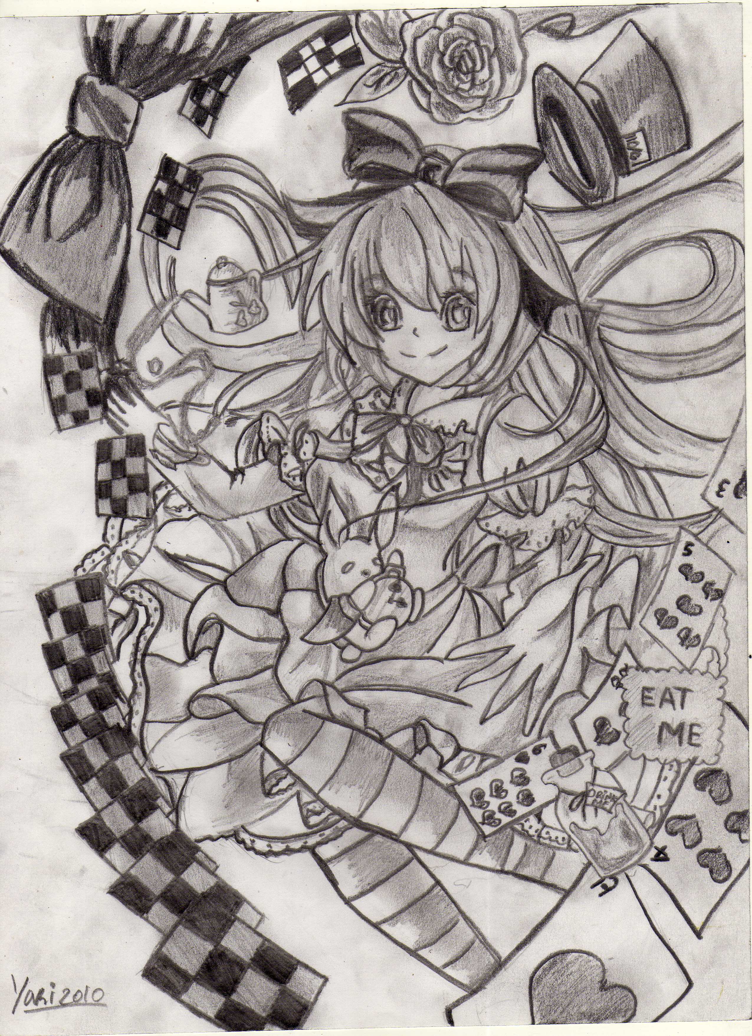 Hola mis queridos compañeros el día de hoy les traigo una versión diferente de Alice, esta es una versión anime a mi en lo personal me gusto mucho esta versión y la quise dibujar claro también le agregue un toque de mi imaginación, para este dibujo trate de agregar la mayor cantidad de cosas que representaran que es Alice, el detalle que mas me gusto fue el conejo blanco en forma chibi.