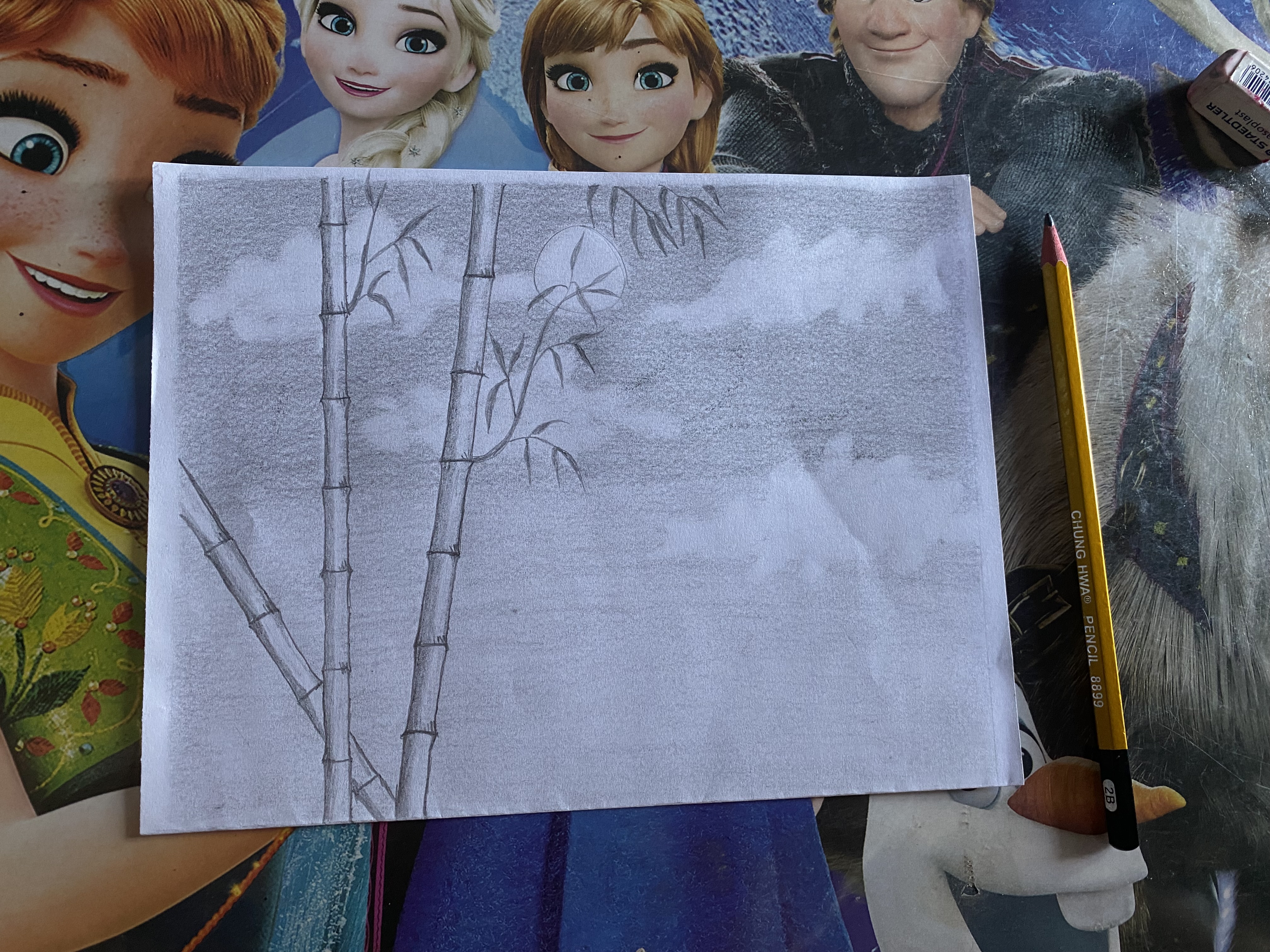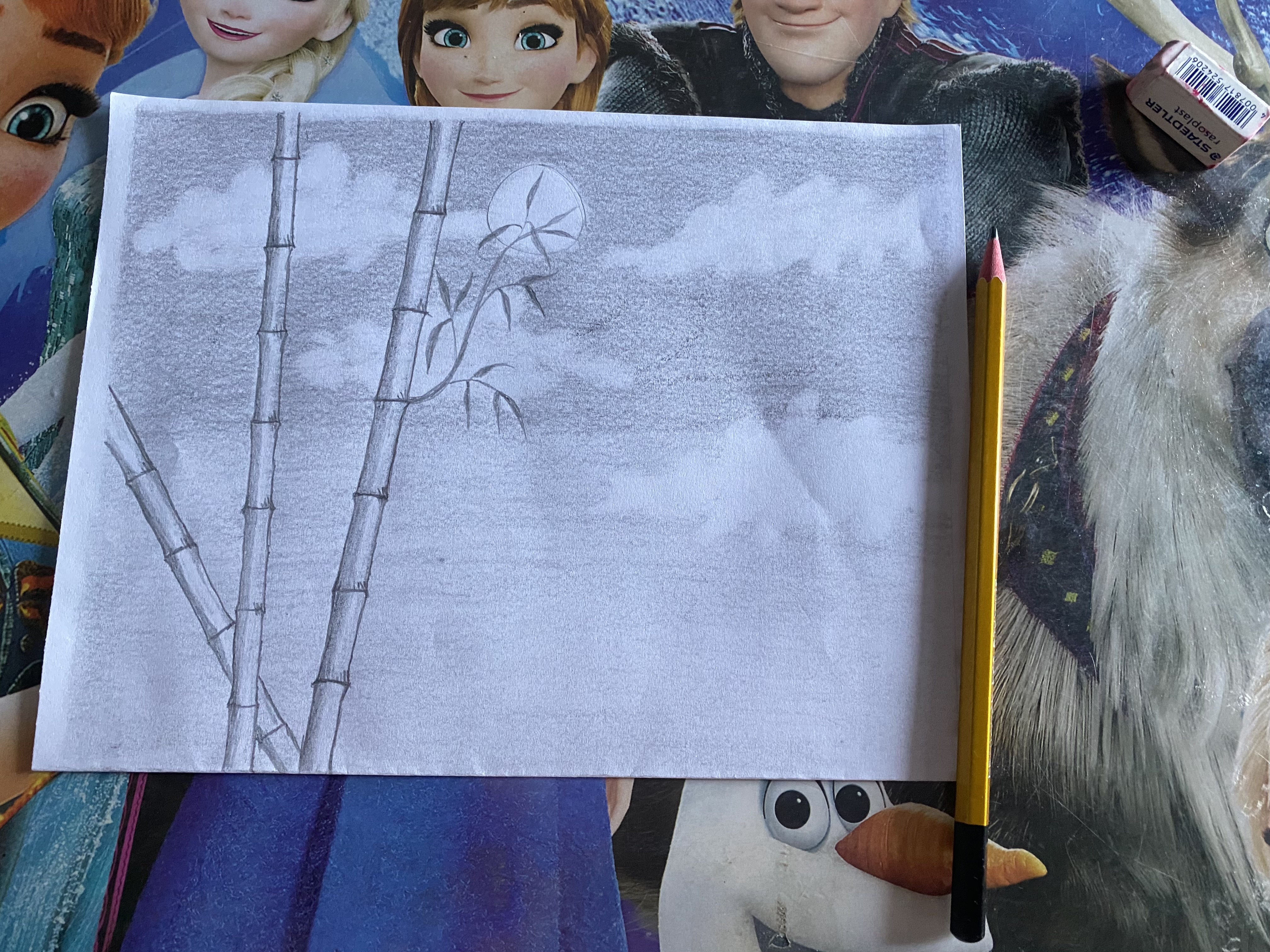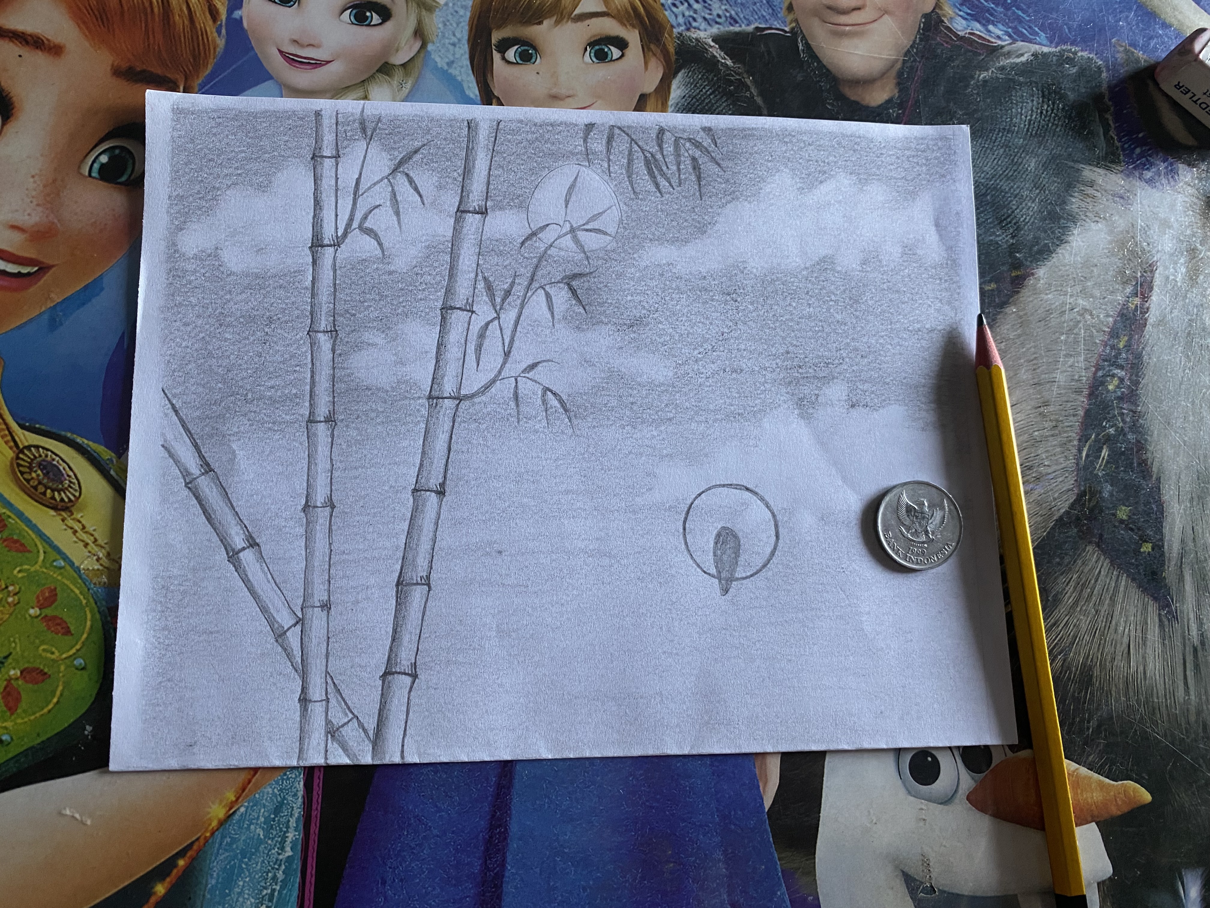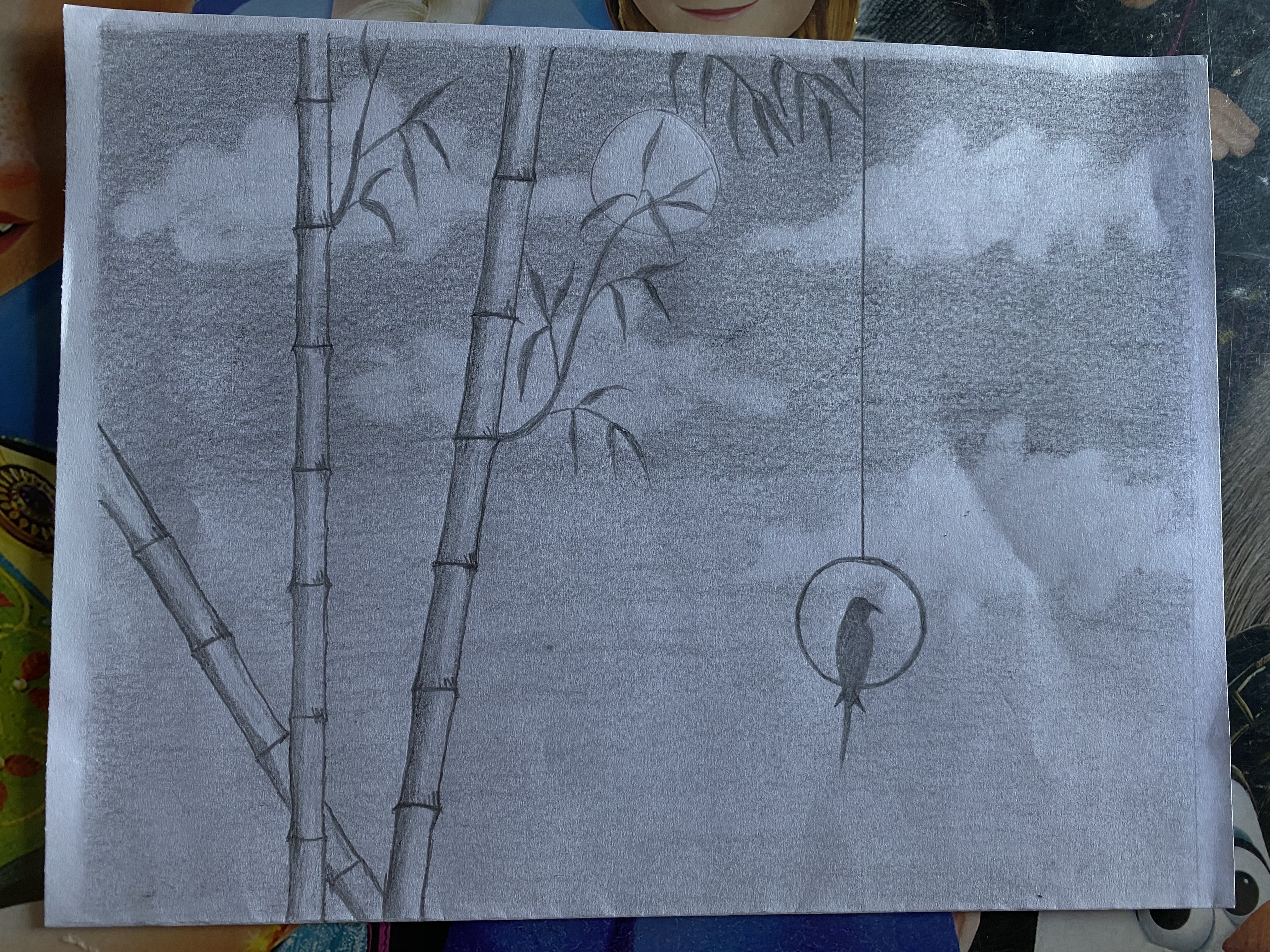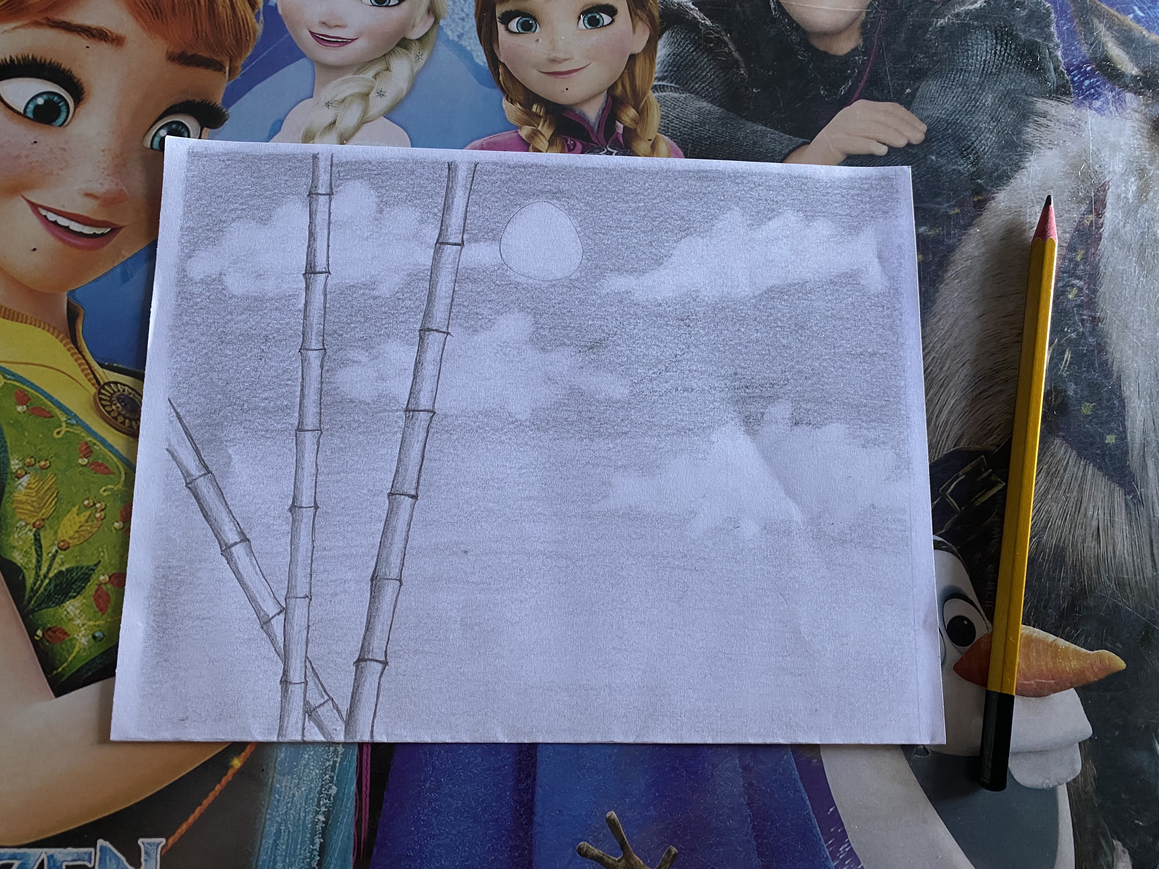 Selanjutnya, kita menggunakan pensil untuk menarsir pada bagian pinggir garis pohon bambu dengan harus hitam pekat dan memudar seiring makin ketengah. Hal ini memberi ilustrasi pohon bambu berbentuk bulat.