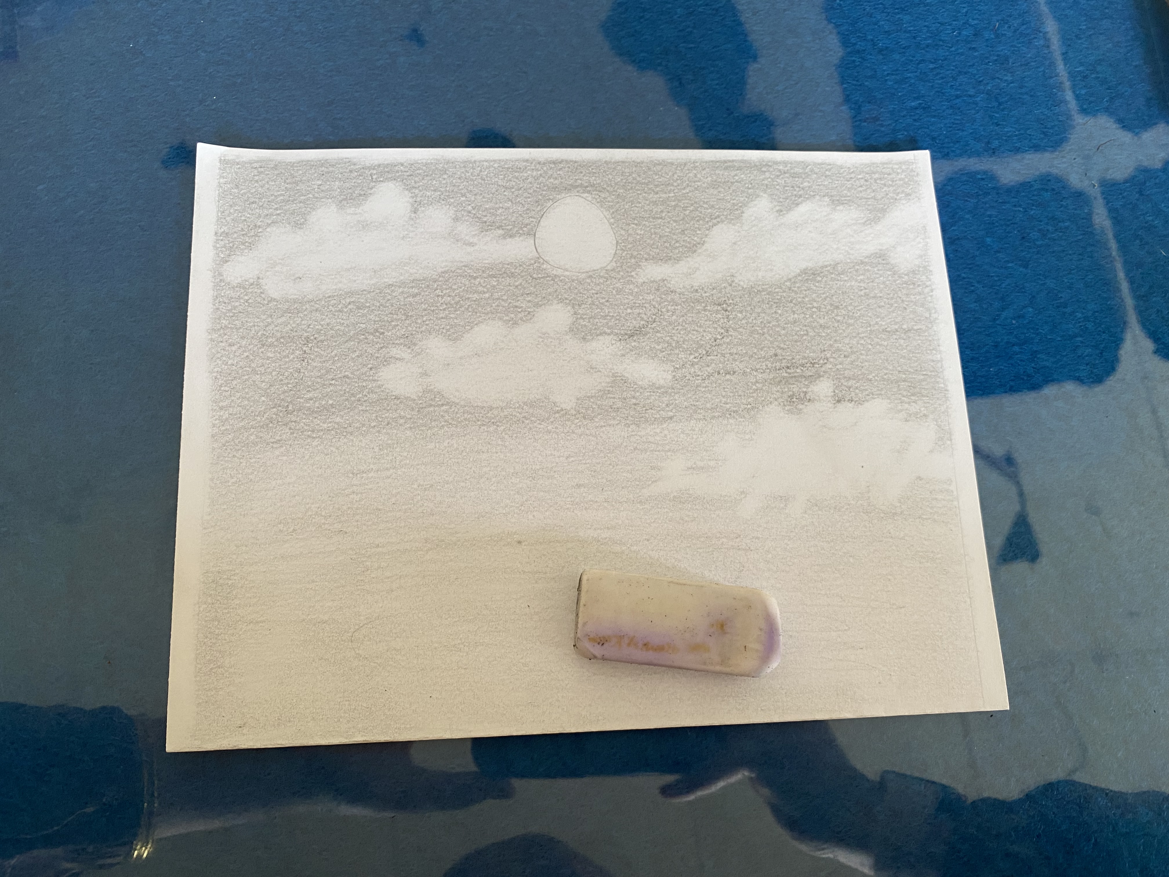 Untuk membuat awan kita menggunakan penghapus. Kita menggunakan penghapus bagian sudut untuk menghapua bagian arsir tadi. Cara mengahapusnya membentuk melengkung kecil sehingga berbentuk awan. Saya membuat empat awan dengan pentuk yang berbeda-beda. Tak lupa saya membuat bulan diantara awan.