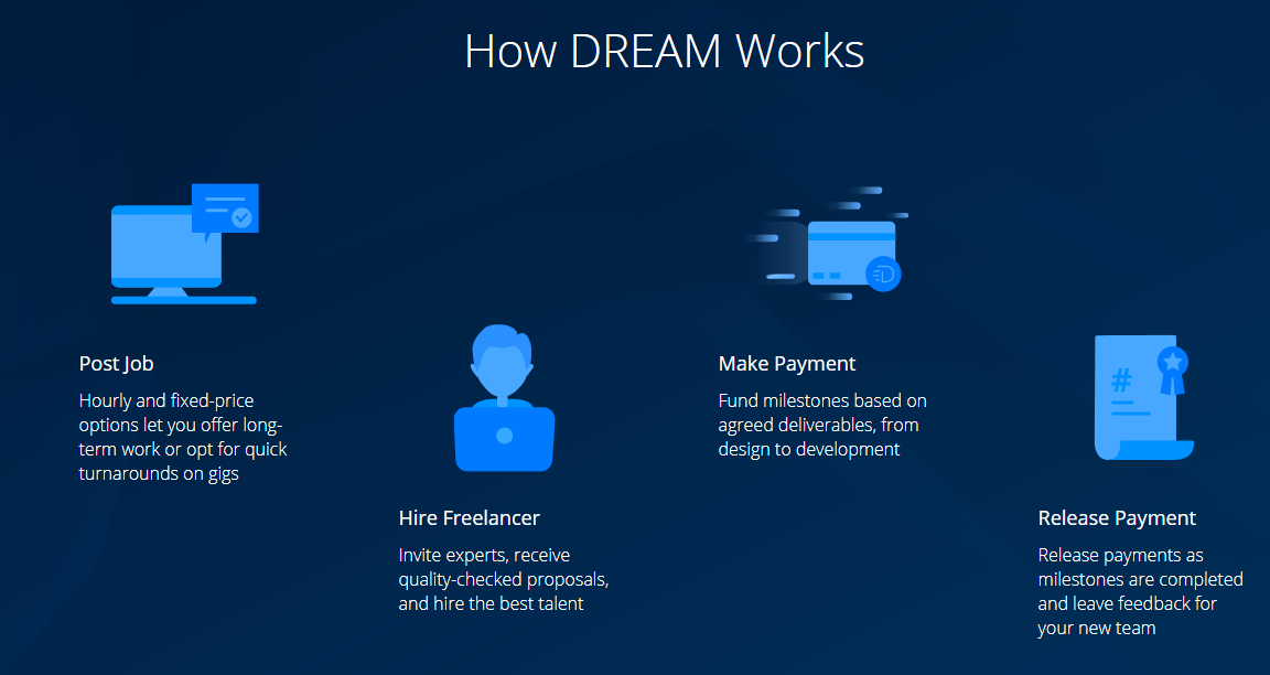 Компания будет использовать фриланс-платформу DREAM, оставаясь в блокчейне, а затем планируется расширение на более крупные и широкие рынки.