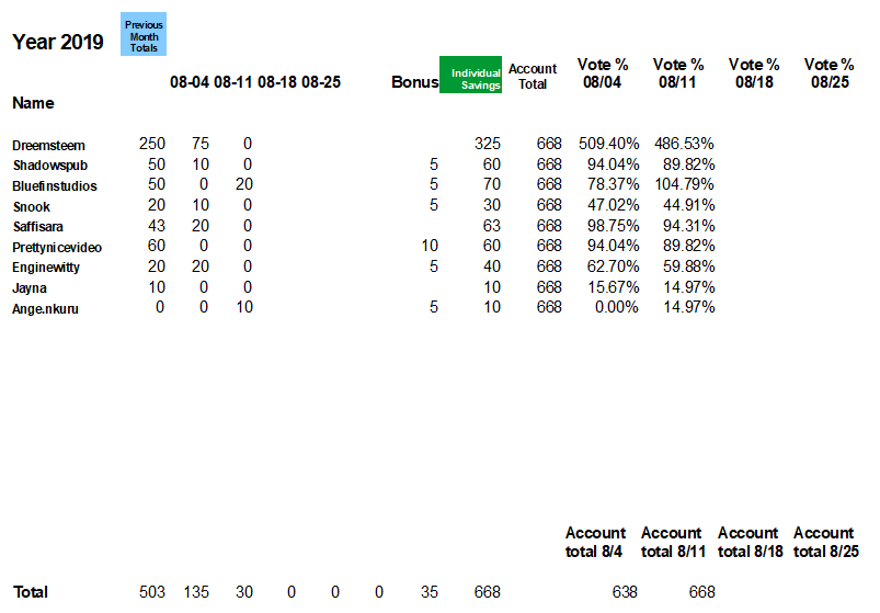 ENJOY!!! (As we gain more members - we will need to adjust the voting amounts accordingly - but until we have over 10 - we should all get at least one 100% upvote!!) yayyyyy! Most likely adjusting this month for August! so enjoy those 100% upvotes all this week everyone! if you want to keep them at 100% - make sure you check out the report to see how much you need to maintain (or gain) to 100% votes :)