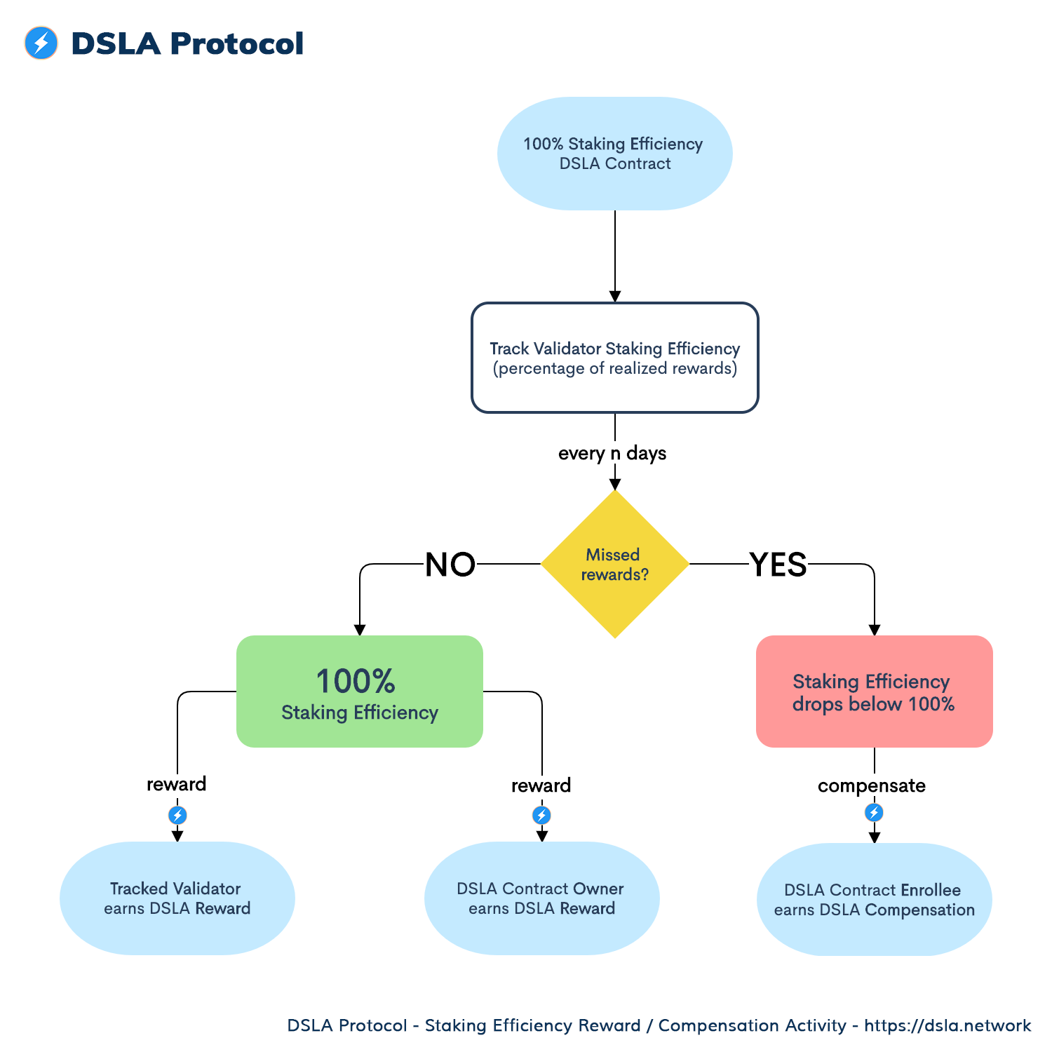 In practice, every n days, DSLA contracts compare the measured staking efficiency of a Validator, with the efficiency objective defined in the Staking Efficiency DSLA contract then :