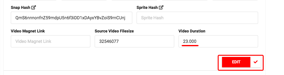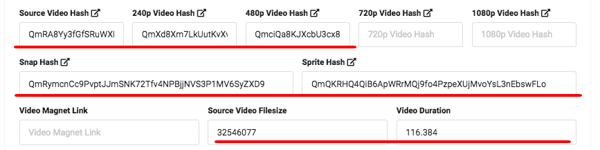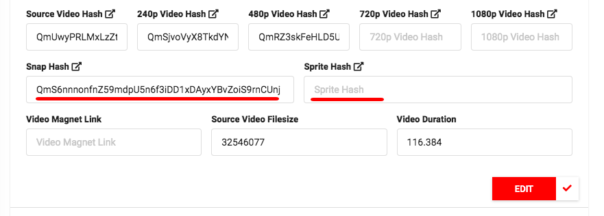All that you see in red will have to be changed: Source Video Hash, 240p Video Hash, 480p Video Hash, Snap Hash, Sprite Hash, Source Video Filesize and Video Duration.