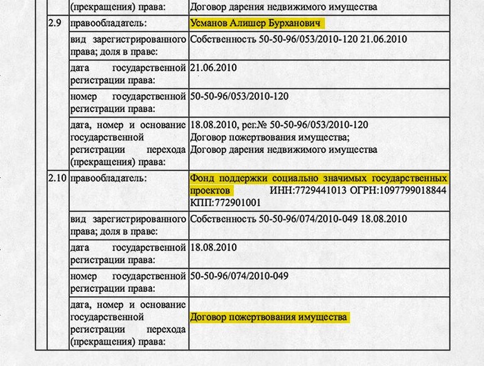 A huge house and 4.3 hectares of land in Znamenskoye town in Rublyovka, worth about 5 billion rubles, were gifted by oligarch Usmanov to the foundation for support of socially significant state projects. This foundation has nothing to do with charity and does not conduct significant activities. The foundation is managed by the same people as the "Dar" and "Gradislava" foundations, which own Medvedev's residence in Ples and other personal properties of the Prime Minister. Such a gift from an oligarch to a government official can only be a bribe.