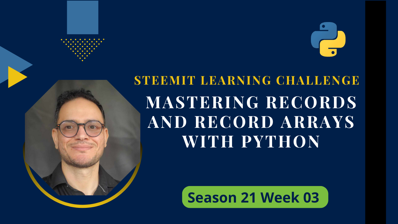 The Dynamic Dev team is pleased to present Week 3 of the Steemit Learning Challenge Season 21, focusing on mastering records and record arrays in Python. This challenge aims to deepen participants' understanding of structured data manipulation using Python's capabilities, without relying on Qt Designer.