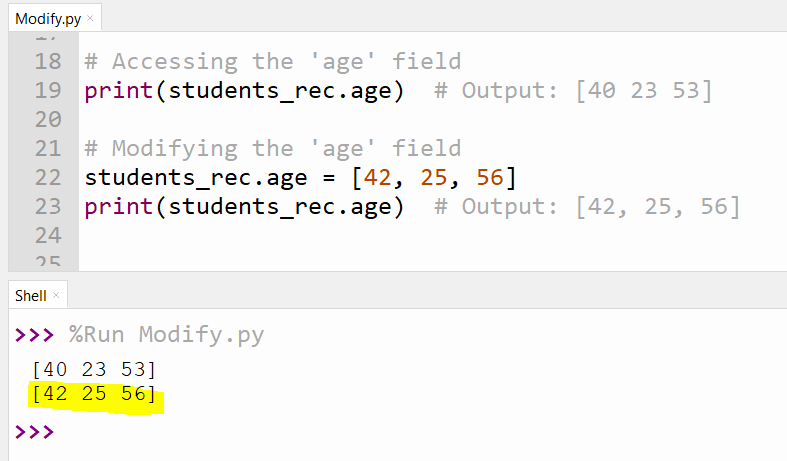 Fields in a record array can be accessed and modified using attribute notation.