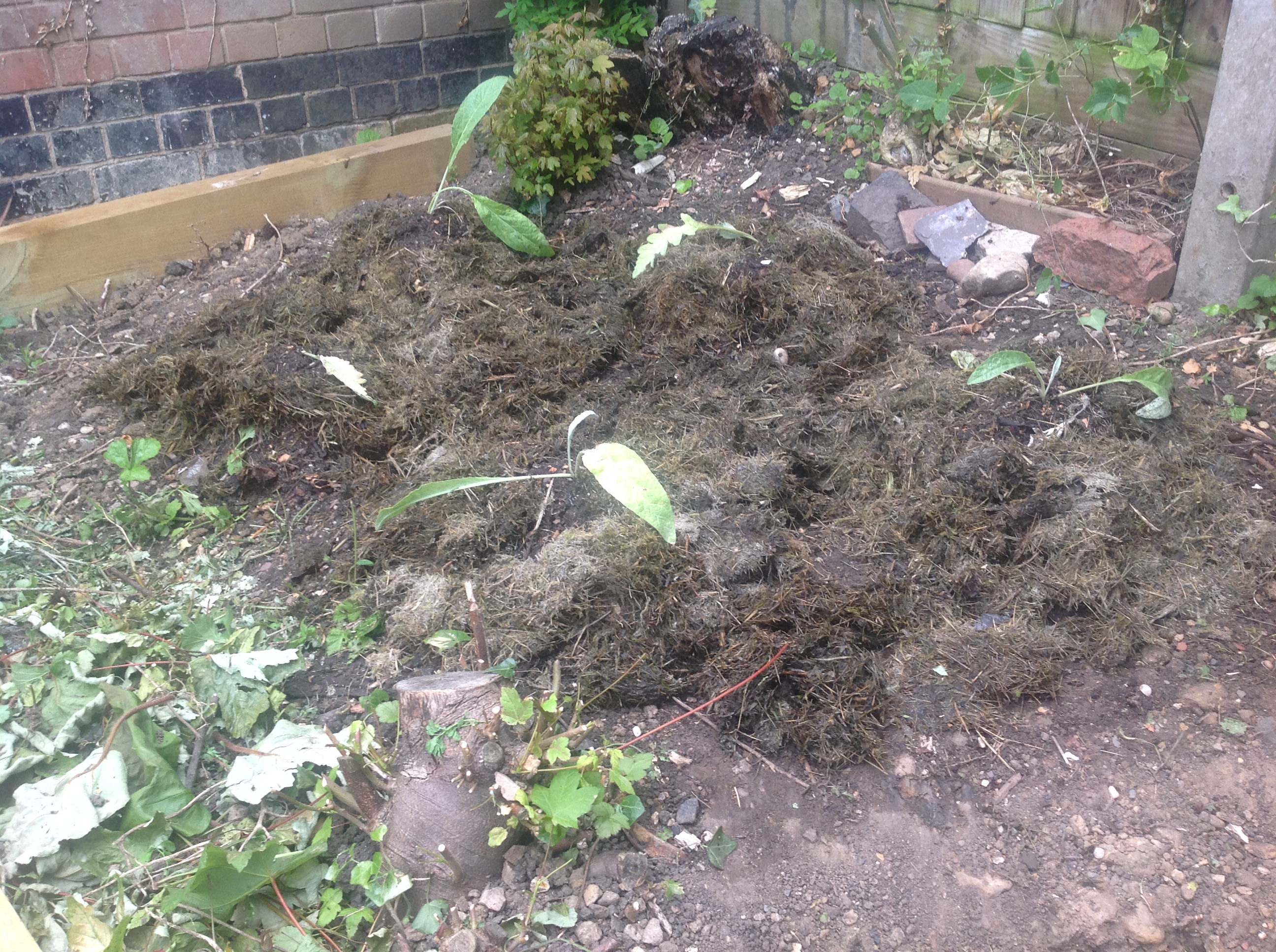 In the afternoon, we started working in the upper terrace in the kitchen garden. I had been busy chopping and dropping earlier in the week. We tidied a little more, removing any brambles, ivy, bindweed or bamboo, and laying the remaining vegetation along the edge of the bed.