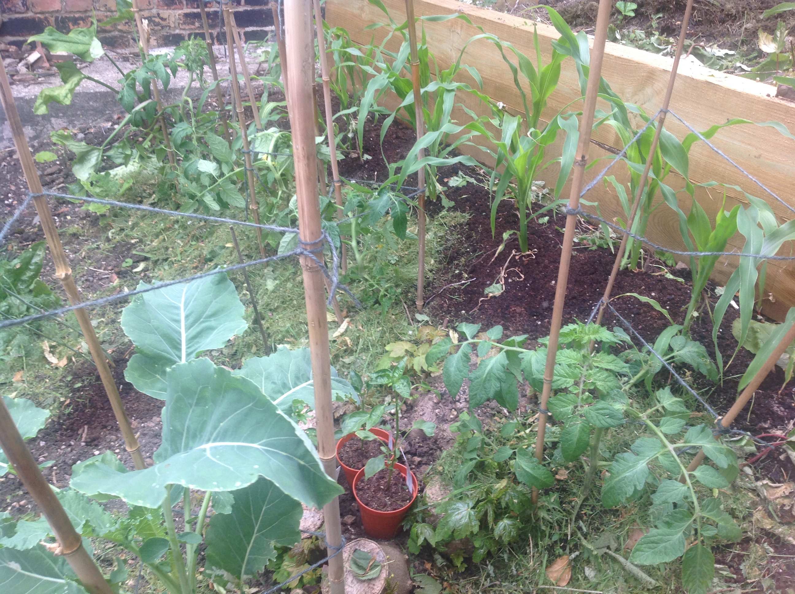 Everything, even the aubergines which had been attacked by slugs, is growing well in the kitchen garden. So well, that many things needed staking. That was the next job, building a little scaffold around each plant to support it. Then spreading the grass clippings.