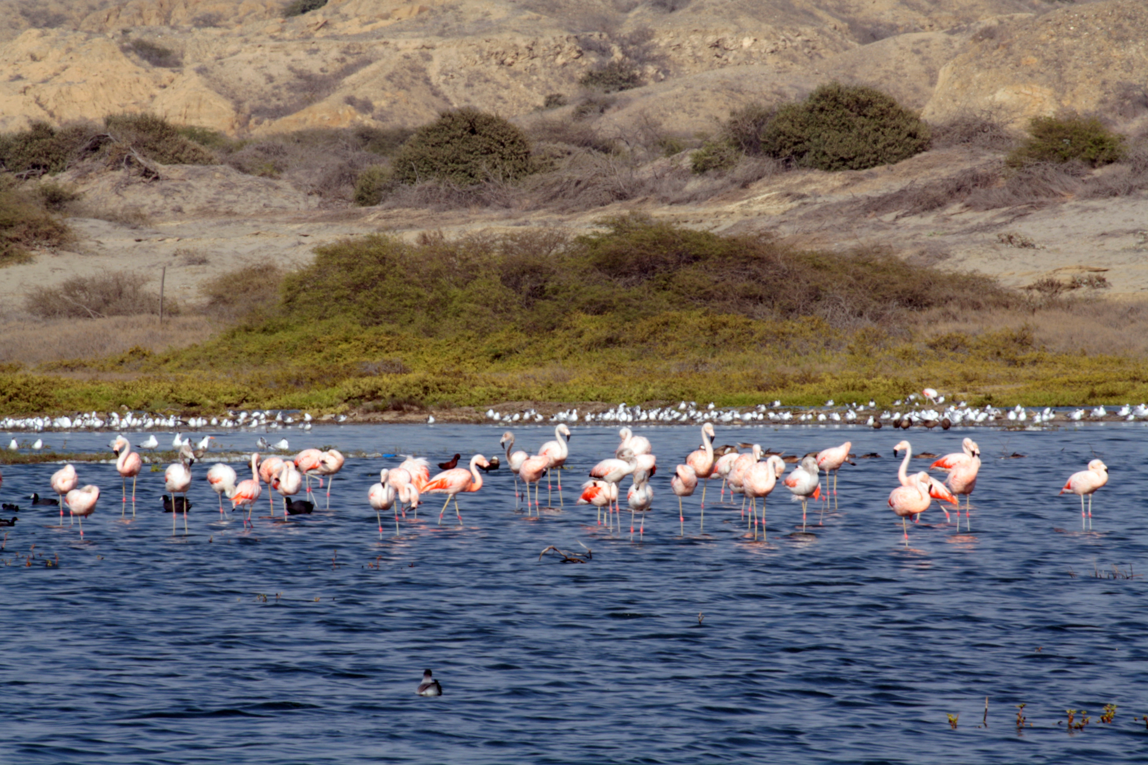 We crossed over a part of the wastewater stream into another potential trail. The landscape was very different, which shows the diversity of the nature that surrounds Piedritas. The vegetation consisted of tall invasive reeds and bamboo-like sticks (Paspalum sp.). It was a little harder getting around as the ground cover was vast. After walking for around a kilometer we came out to an opening with a stunning view of the ocean. A group of migratory aquatic birds could be seen floating in a nearby tributary so we made our way over and saw a few different species including herons, storks, ducks, flamingos, and spoonbills.