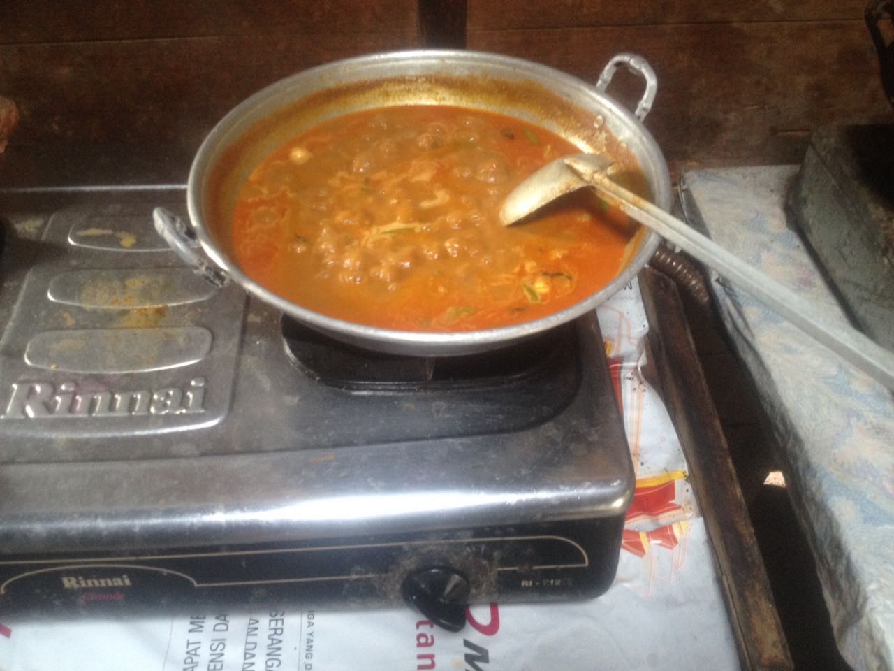 Blend the various spices of curry on top, such as chili, onion, garlic, coriander and others until smooth. Should diuleg just so that the aroma and essence out of the sauce.
