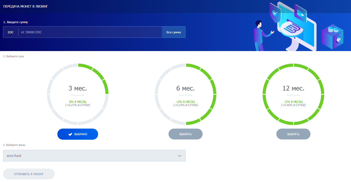 Чтобы воспользоваться лизингом, требуется сдать в аренду не меньше чем 30000 монет EDC. Указанная услуга находится по адресу: https://blockchain.mn/ru/leasing-ru/. Сумма вероятной прибыли напрямую зависит от периода аренды:
