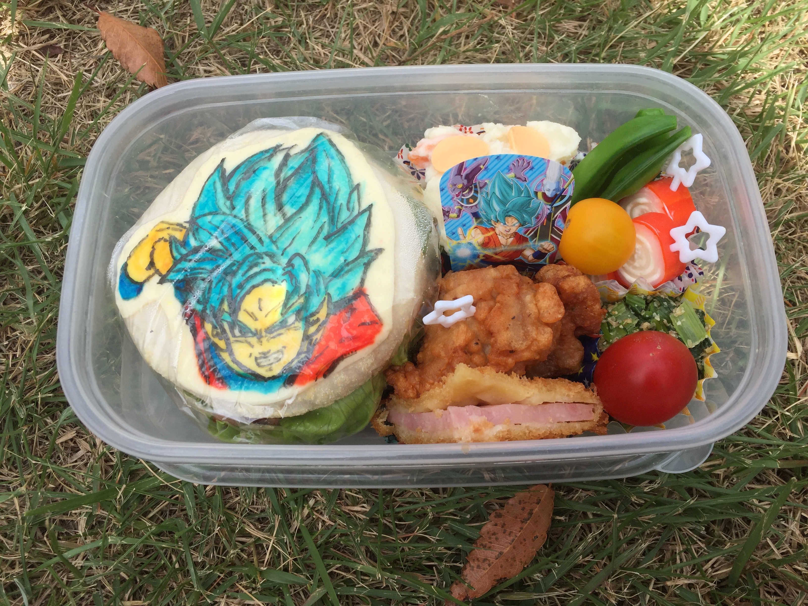 Underneath the Dragon Ball character, which I think my wife made by painting food coloring onto a sheet of gelatin and laying it over a piece of cheese, is an English muffin with a hamburger inside. Next to that is a piece of karage (fried chicken), and a portion of ham Katsu (breaded and fried ham). Above the chicken is something like a cupcake wrapper with potato salad inside, and the red swirly thing is steamed fish rolled up with cheese. As for the vegetables, they’re easily identifiable;-) It’s all edible.