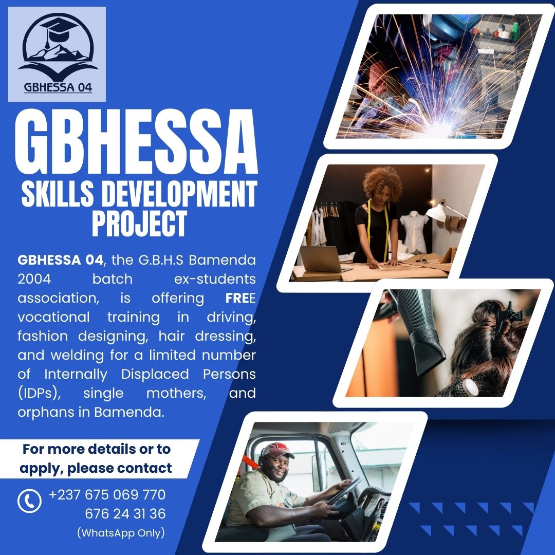 GBHESSA 04, the ex-students association of G.B.H.S Bamenda’s 2004 batch, is offering FREE vocational training in driving, fashion design, hairdressing, and welding for a limited number of Internally Displaced Persons (IDPs), single mothers, and orphans in Bamenda.