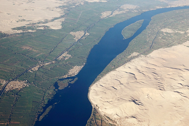 The Nile River: The name of the Nile is derived from the Greek word (Milos), which means valley or river valley, and the ancient Egyptians and Greeks called it Kim or Kimi, meaning the Black River because of the color of the black sediments that the river carries when it is in flood, and the Nile is the longest river in the world. The world was called the Gate of African Rivers, with a length of approximately 6,650 km and extending from the south of the equator and flowing north through northeastern Africa to pour into the Mediterranean Sea, which is bordered from the north with a total area of approximately 3.3 million square kilometers, and bordered to the east by hills The Red Sea and the Ethiopian plateau, and to the south the highlands in East Africa, and to the west, it is bordered by Chad and the Congo Basin, and the Nile River passes through ten countries: Tanzania, Burundi, Rwanda, the Democratic Republic of the Congo, Kenya, Uganda, South Sudan, Ethiopia, Sudan, and the cultivated part from Egypt. The Nile River basin covers about a tenth of the area of the African continent, which was the scene of the development of advanced civilizations in the ancient world, where the people who were among the first to develop the arts of agriculture and the use of the plow resided on the banks of the river.