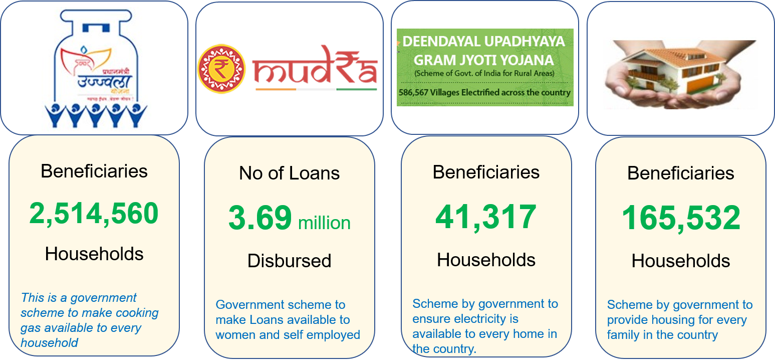 BJP has today recovered the lost ground. This has also been made possible due to the faltering strategy of the opposition - namely Congress (as mentioned above the alliance of 2017 rather than gaining momentum has actually fizzled out). On the other hand, the good work done by the central government in the state over the last few years is standing out and being appreciated (data with respect to Gujarat for the central schemes rolled out is presented in the graphic below).