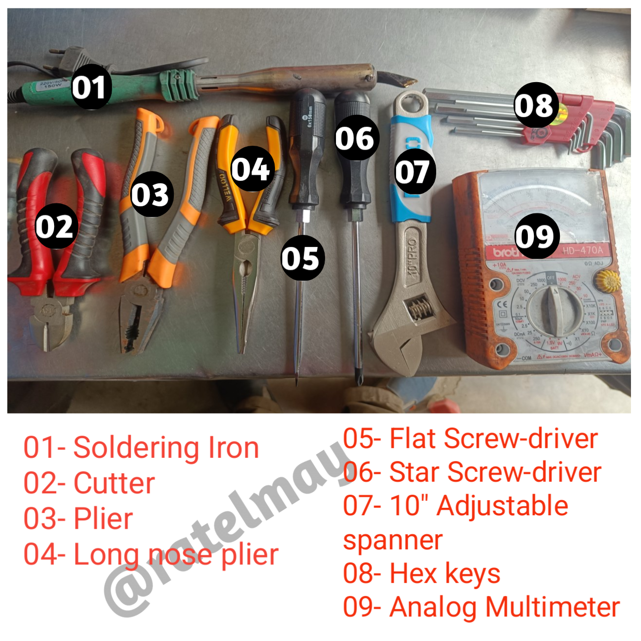 04- Long nose plier: This tool is used to grips small objects that is in tight condition or space. I use it mostly in my shop.