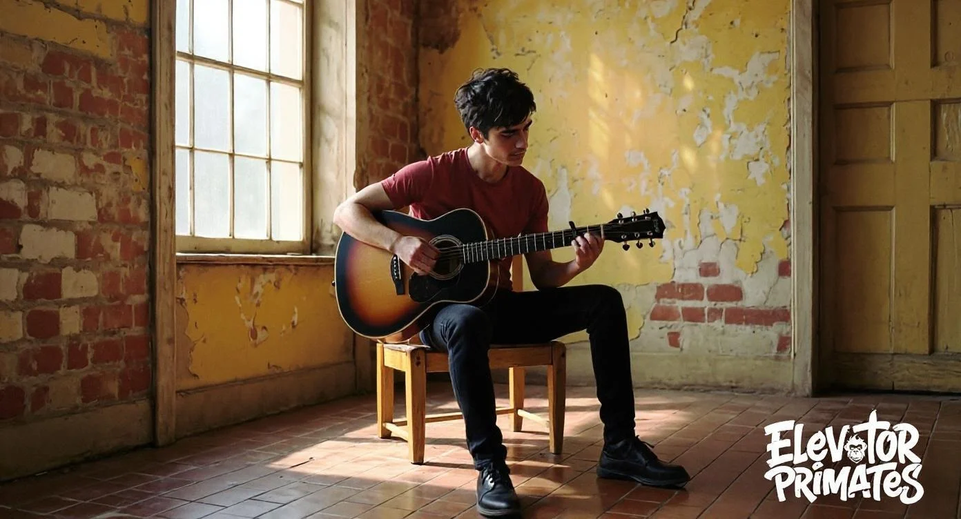 This photo captures Zeke in one of those rare moments, sitting in an old sunlit room with nothing but an acoustic guitar and a melody that’s been looping in his head all day.