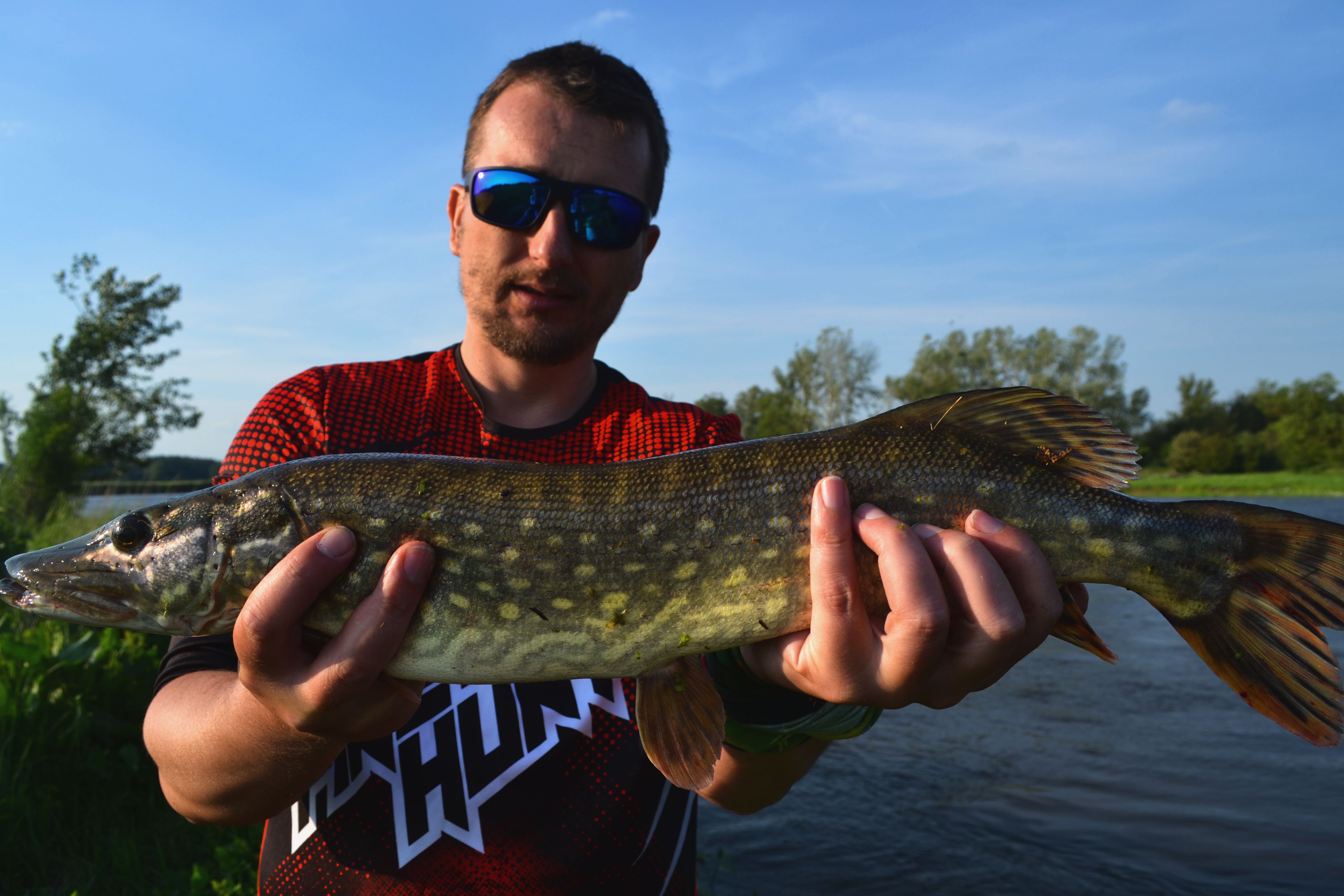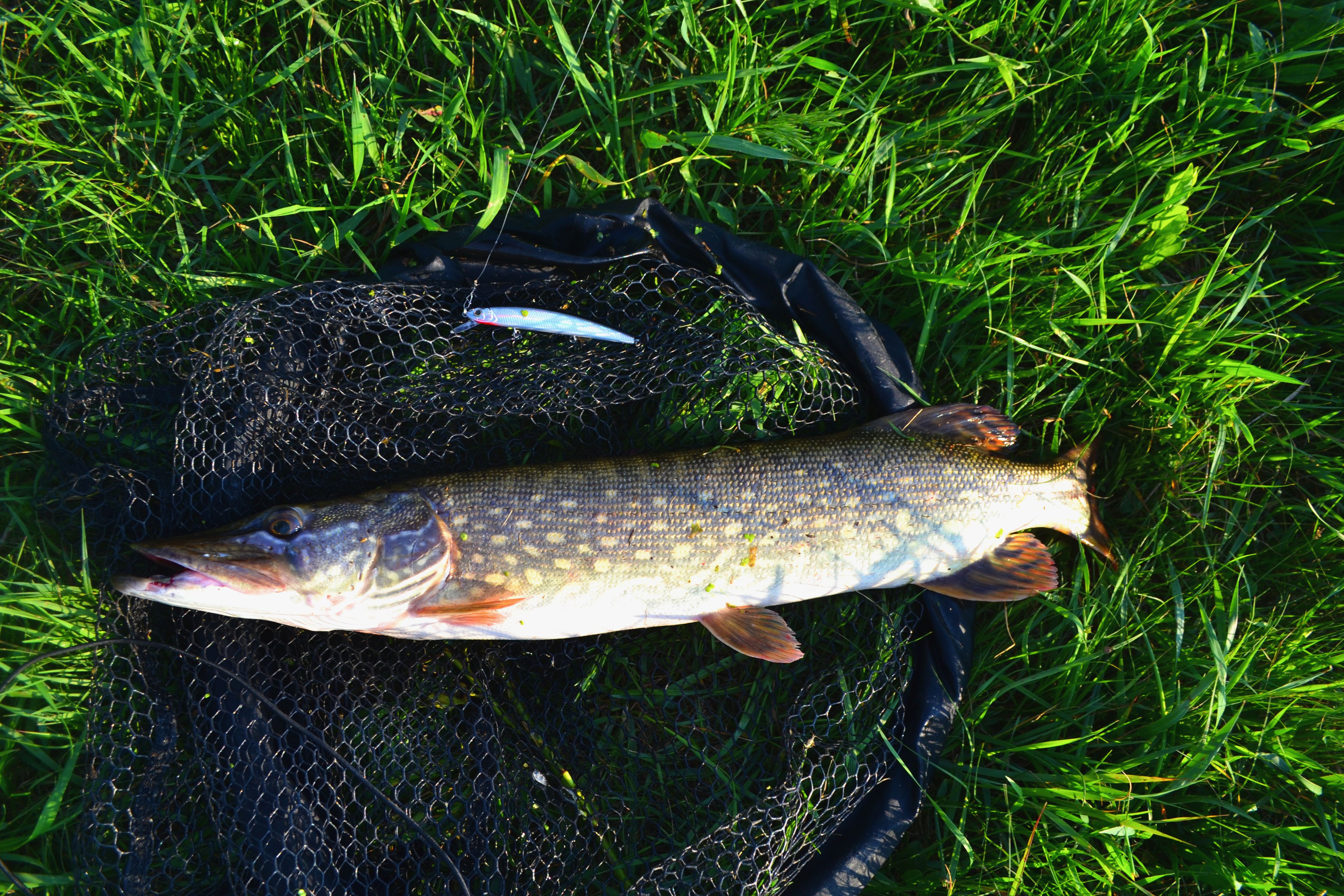 Po kilku rzutach potężne uderzenie. Trochę mnie zdziwiło bo ryba zaatakowała już na stojącej wodzie. Po chwili moje zdziwienie zamieniło się w niepokój. Nad wodę wyskoczył konkretny szczupak a ja nie miałem przyponu wolframowego. Fluorocarbon 0,25mm mógł nie wytrzymać zębów szczupaka. Na szczęście szczupak zapięty za sam „nosek” kotwicą na końcu woblera. Po chwili był już na sesji zdjęciowej.