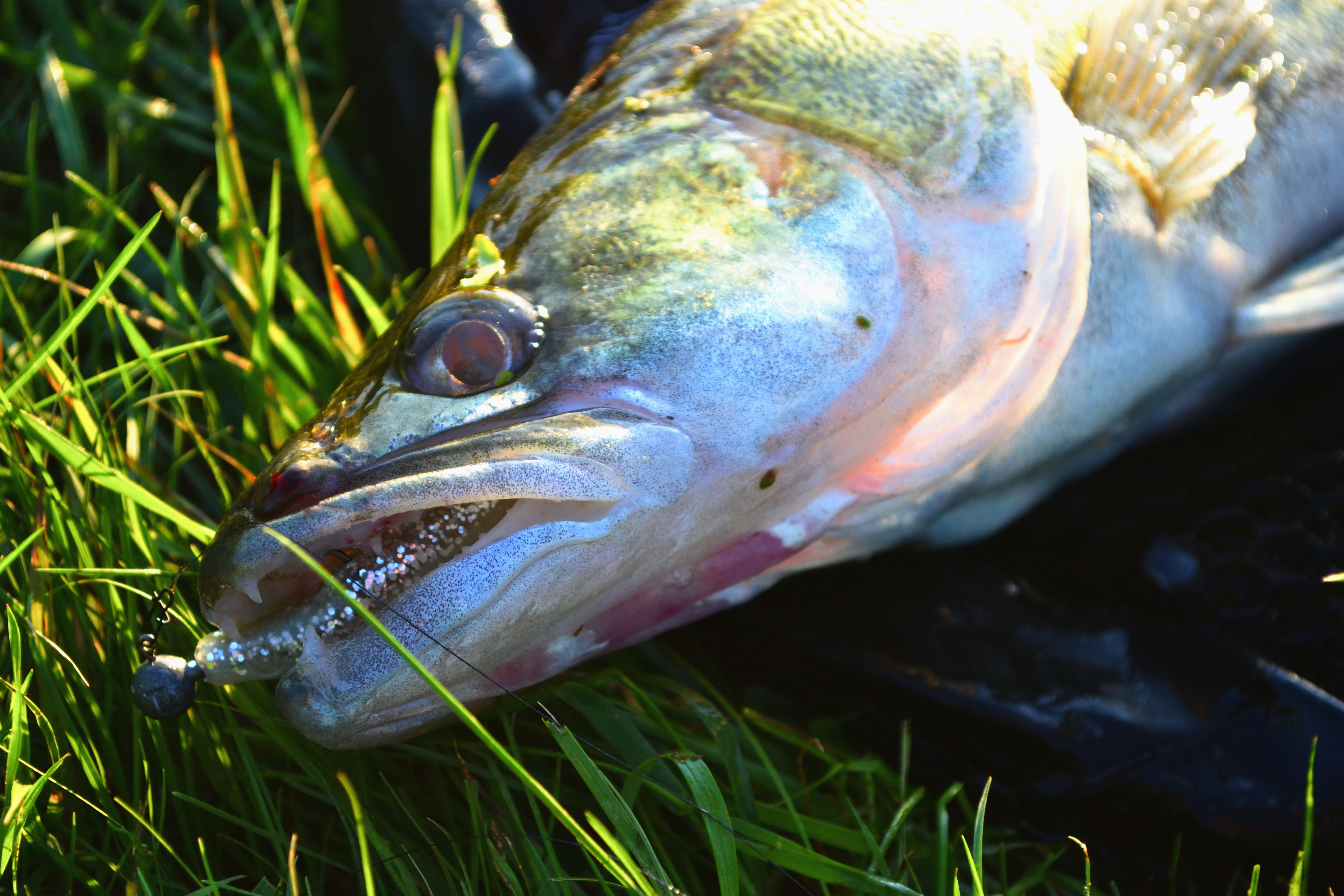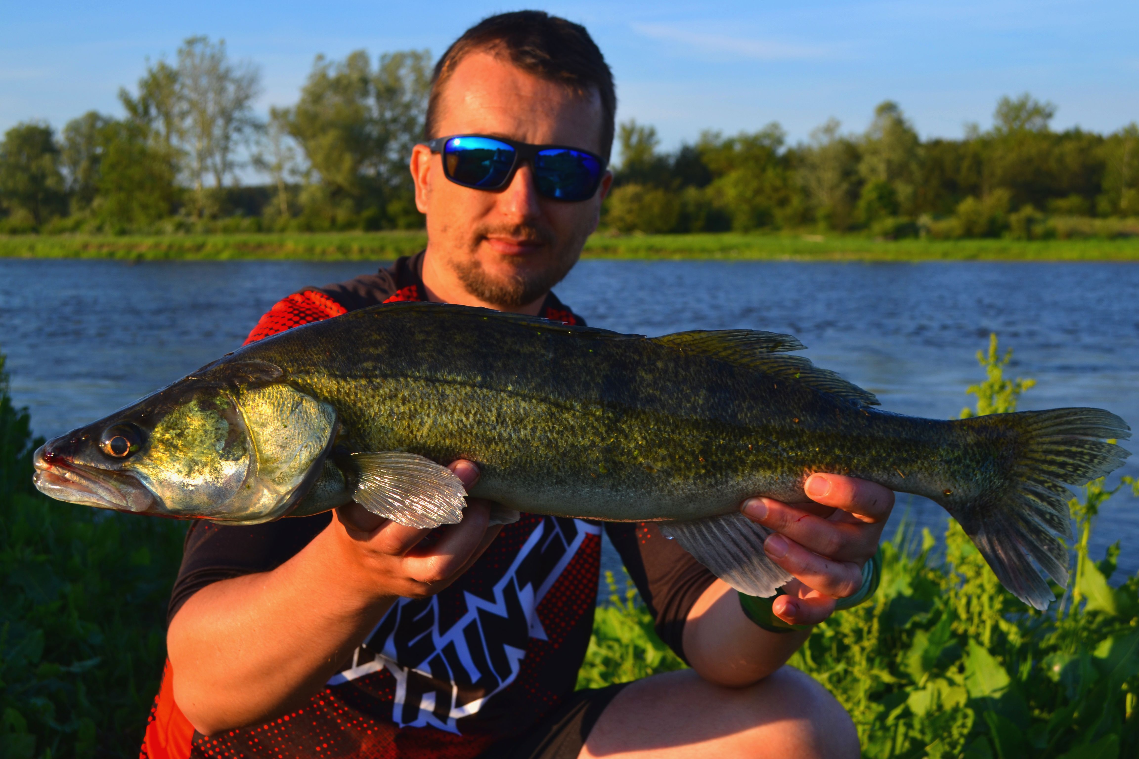 Postanowiłem zmienić taktykę. Skoro są szczupaki to trzeba założyć wolfram i przynętę, która sprawdza się na szczupaki. Strike Pro Piglet Shad 8,5 cm posłane do wody z misją skuszenia szczupaka. Obłowiłem miejsce ze stojącą wodą niestety bez efektów. Stwierdziłem, że jeszcze rzucę w rynnę przy brzegu. Pozwoliłem gumie opaść nad dno i delikatnie poderwałem. Poczułem charakterystyczne pstrykniecie, kilka obrotów korbą i solidne uderzenie. Zachowanie zaciętej ryby nie wyglądało mi na szczupaka. Ryba dała się holować w moją stronę ale nie chciała się pokazać, trzymała się dna. Dopiero jak była pod nogami pokazała co potrafi. Zaczęły się odjazdy, niedługie ale silne. Kołowrotek co chwilę oddawał linkę. W końcu przy powierzchni pojawia się zdobycz, piękny sandacz.