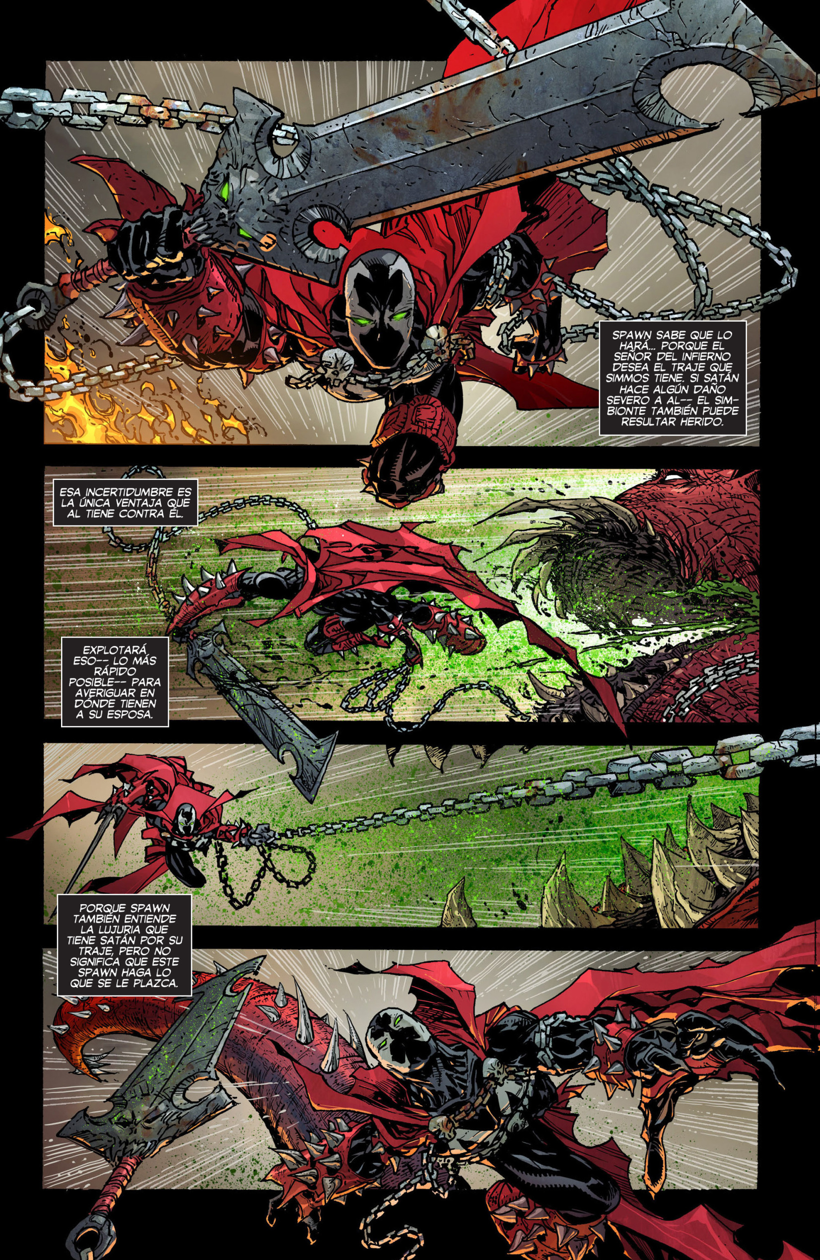 El argumento va evolucionando mostrandonos como es el personaje ahora, como era antes y como evoluciona. Aunque Spawn no es malo de corazón, su facilidad para caer en la ira hace que mate a sus enemigos sin piedad, usando todos sus poderes los cuales irán mejorando con el paso del tiempo. Se nos van presentando enemigos cada cual más interesante, desde un asesino pederasta hasta los mismísimos dueños del Infierno, y mayores retos que no se van a decir aquí para no revelar datos de una forma muy amena y bastante entretenida.
