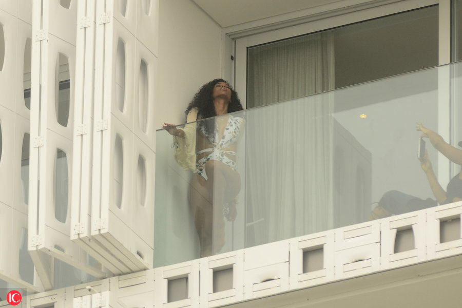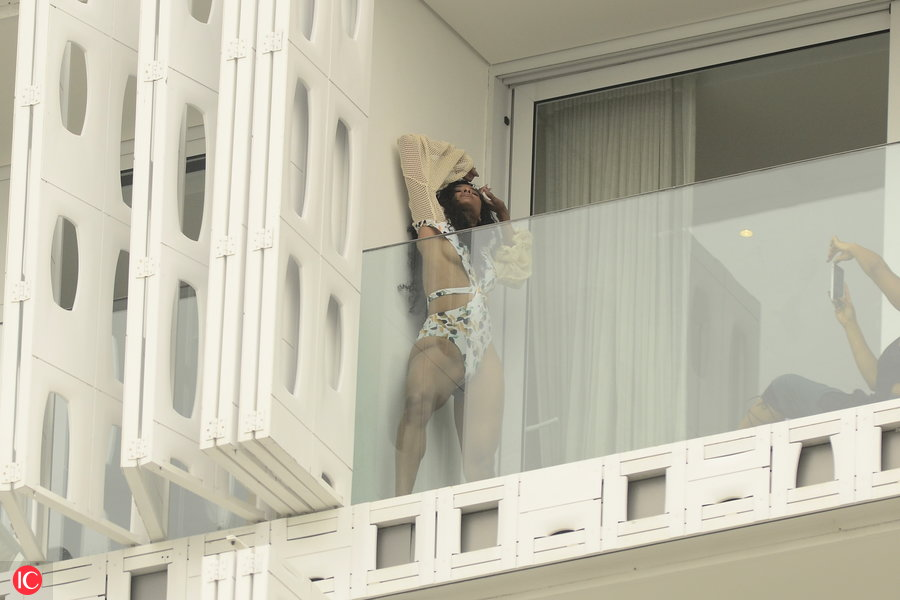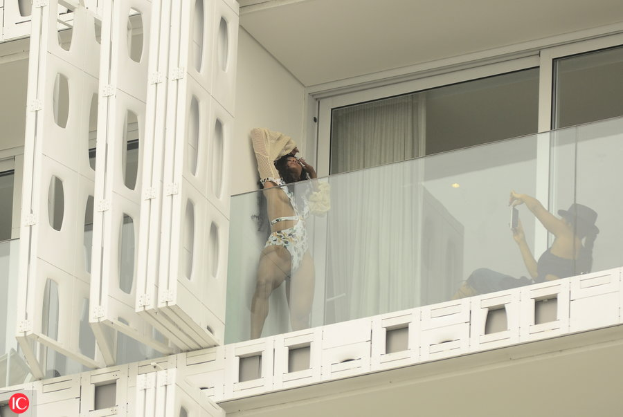Ciara Poses on Hotel Balcony