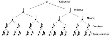 Entonces, si vemos las figuras musicales donde la redonda es la figura mas larga, que dura cuatro tiempos y la empezamos a dividir, obtenemos que de una redonda, salen 2 blancas, de 2 blancas, 4 negras, de 4 negras 8 corcheas y de 8 corcheas 16 semicorcheas.