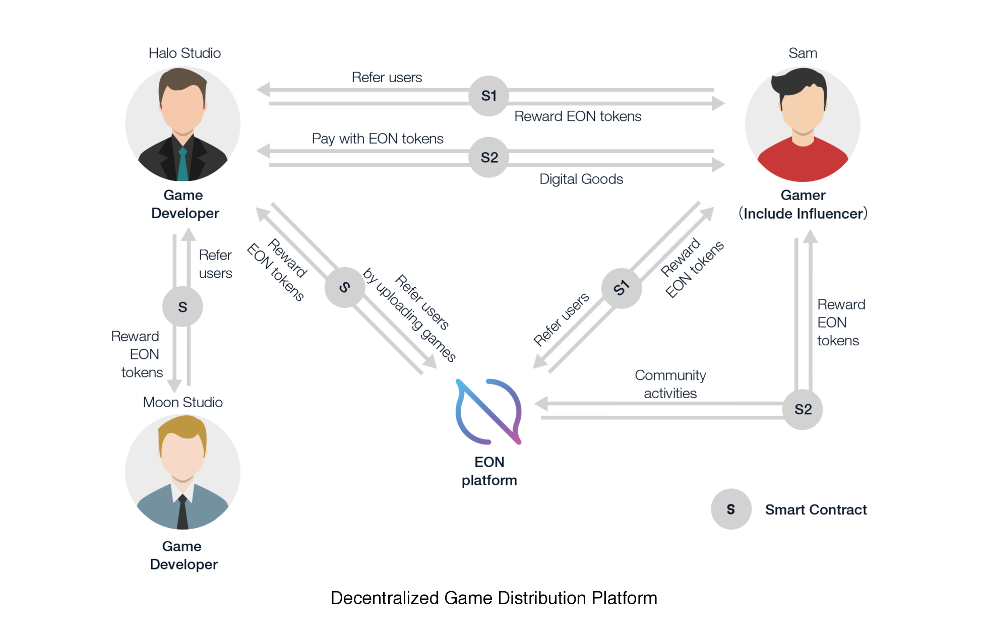 The EON platform will serve as an interactive ecosystem for content creation and distribution between developers and gamers, eliminating the need for a third party governing distribution platform. Through the EON platform gamers will have direct access to roll-outs from developers and will be able to make instant game purchases regardless of their nationality and geographical location through the governing currency of the EON Ecosystem – the EON token.