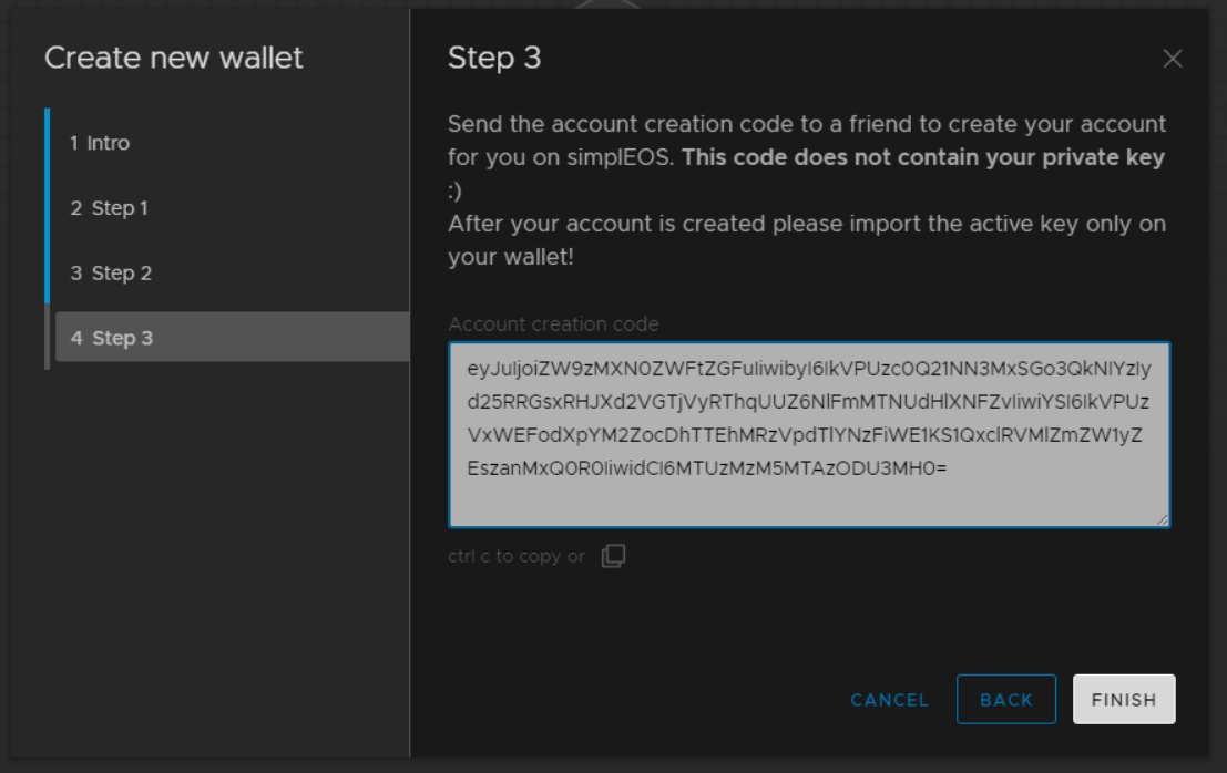 Al final del proceso un código será generado. Tendrás que enviar el código a un amigo que tenga EOS en la Mainnet, para que pueda crear tu cuenta usando SimplEOS.