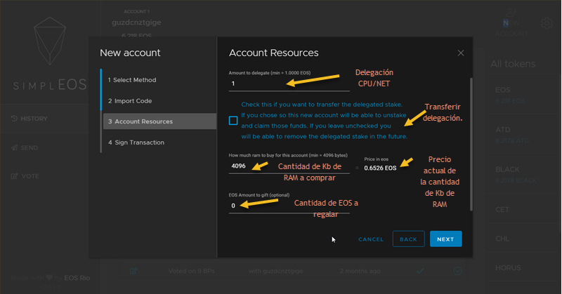 - A continuación, llegamos a la parte crucial de las creaciones de cuenta, el pago. En este punto se determina cuanta cantidad de EOS se delega o se transfiere para el CPU/NET, cuántos RAM deseas comprar para la cuenta y una cantidad opcional de transferencia de EOS disponibles para la nueva cuenta. Los montos que se reflejan allí es la cantidad mínima que requiere la cuenta para realizar sus funciones, pero podría llegar a limitar su función por la capacidad comprada o apartada. Hay un cuadro azul que indica que si deseas delegar los EOS para CPU/NET o transferirlos de manera definitiva. Si lo tildas se transferirá de manera definitiva la cantidad de EOS y el usuario nuevo podrá retirarlos libremente con el lapso de 3 días para hacerse efectivo. Si deseas delegarlo, no se tilda el cuadro y podrá retirar la delegación cuando desee con un lapso de 3 días para hacerse efectivo, se puede retirar la delegación usando la herramienta de EOStoolkit.