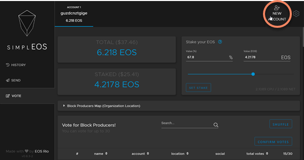 Herramientas como EOStoolkit (requiere una cuenta EOS afilidad a Scatter), monederos como EOSvoter del TeamGreymass son algunos ejemplos de herramientas confiables para manejar y crear las cuentas EOS. En éste caso descargamos y usamos SimplEOS.