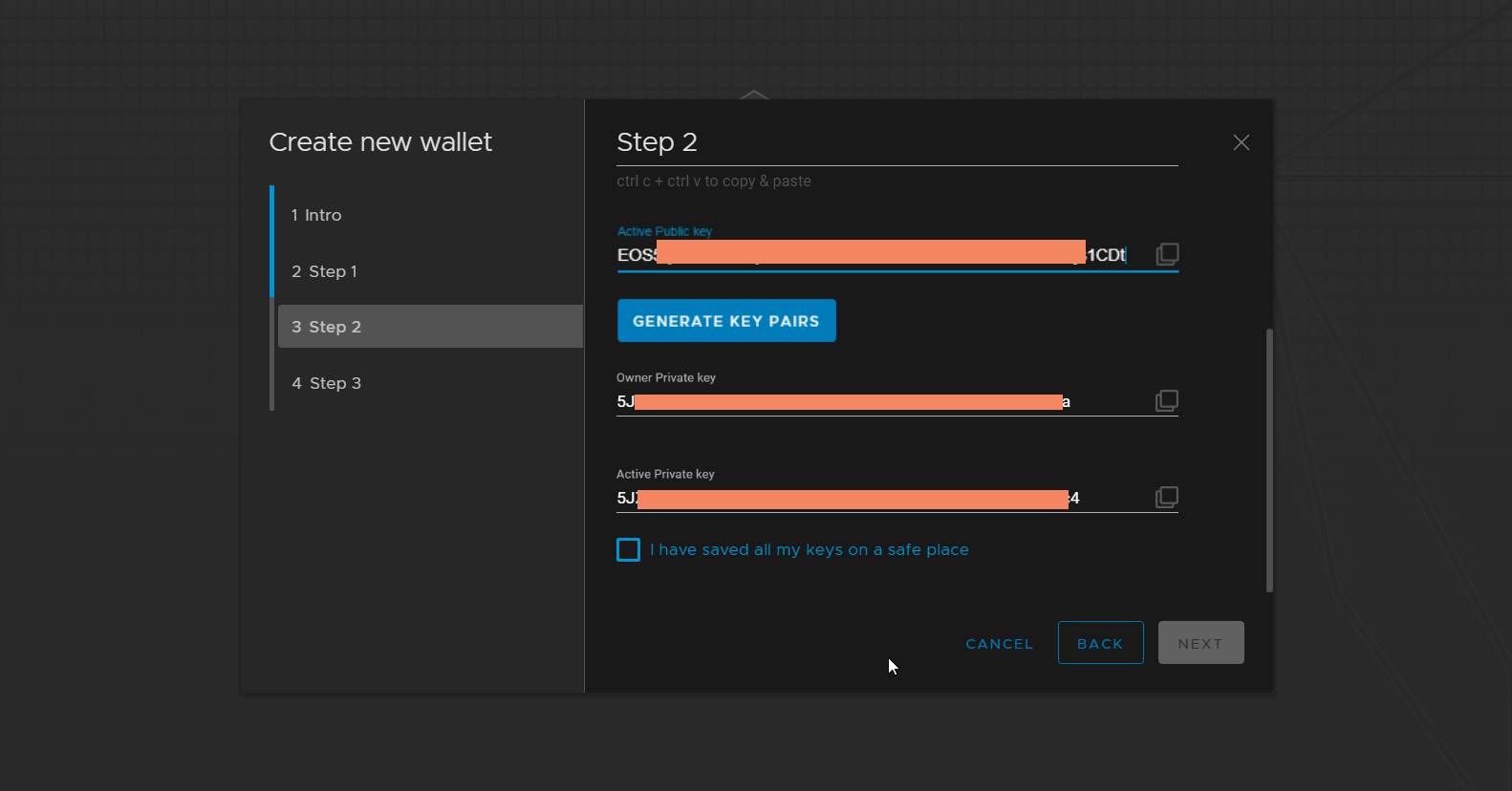 OJO: Recuerda guardar las llaves en algún sitio seguro fuera del internet, especialmente las privadas. Se recomienda usar el generador teniendo el internet desconectado para evitar hackeos. Jamás compartas tus llaves privadas en sitios y personas extrañas. Un consejo: Las llaves públicas empiezan con EOS y las privadas con 5J, así te ayudará a evitar confusiones.