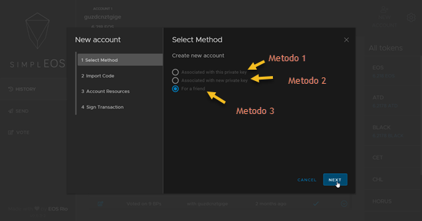 - En la pantalla principal de SimplEOS, acceder a crear cuenta y seleccionamos el método 3 "For a friend" que es el método que utilizamos en ésta guía.