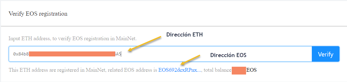 Si tuviste tus tokens ERC-20 en una dirección Ethereum y los registraste en EOS.io antes de su lanzamiento, ya tienes automáticamente tu cuenta creada y podrás verificar tu dirección (que se ha creado automaticamente por la mainnet) en EOSpark colocando la dirección ETH que registraste, haciendo click en la dirección EOS podrás verificar tu nombre de usuario.