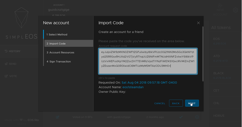 - El siguiente paso es ingresar el código que el solicitante generó, asegúrate que coincida el nombre de usuario , la fecha y las llaves públicas. En nuestro ejemplo eos1steamdan de @steamdan es nuestro solicitante.
