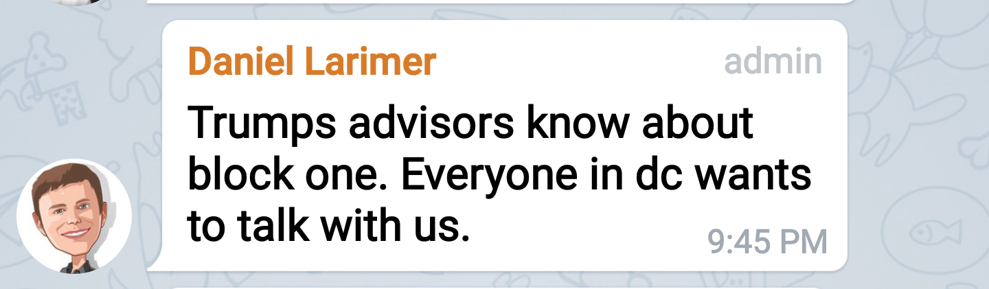 However, maybe it's just me, but his statements that a) trump advisors know about block.one, and b) that everyone in DC wants to talk to them, is not filling me with major excitement. At least not as far as decentralization and no regulation goes. I suppose speaking with block.one might not mean EOS specifically, but about blockchain technology in general. However, rubbing elbows with DC-ites? Uh, pass. :)
