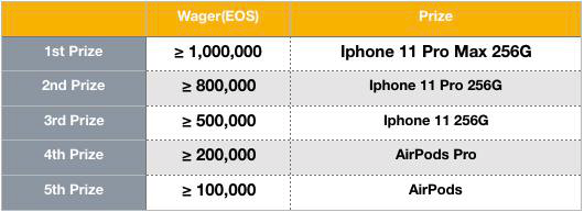 1)During the event, players who login BigGame via ET wallet and wager on any of the games with an account whose referrer is “eostokenpark”, will gain a prize according to his total wager. Each account will be granted one prize only according to the highest wager.