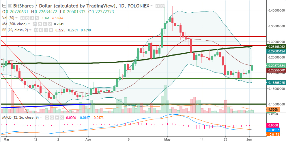 Seems like EOS is becoming the leader today when it comes to price action. Great volume and MACD is actualy signaling new upside move. Are we looking for a new uptrend finally? BTS is a bit weaker, smaller move to the upside but similar MACD signal. Looks like EOS has finaly higher high, now we need higher low as well for new trend to get confirmed. BTS is still not there, volume is still lacking and it still doesn’t have higher high. There is a significant resistance at 200MA. Overall we had nice day today in crypto especially in EOS. SBD had nice move as well today.