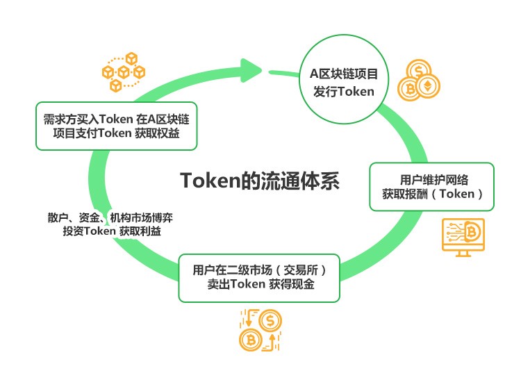 所以区块链项目方都会发行token,用户通过维护区块链网络(挖矿)获得token,再通过二级市场(交易所,私下交易等)将token变真正的法币收益(比特币就是这样一个流通过程,这里的token即数字货币)。