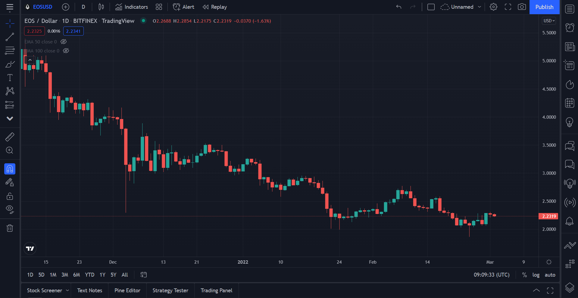 EOS current price on March 2, 2022erev (60)in #eos • 4 years ago The price of EOS on March 2, 2022, is $2.2319 #cryptocurrency #currentprice #tradingview